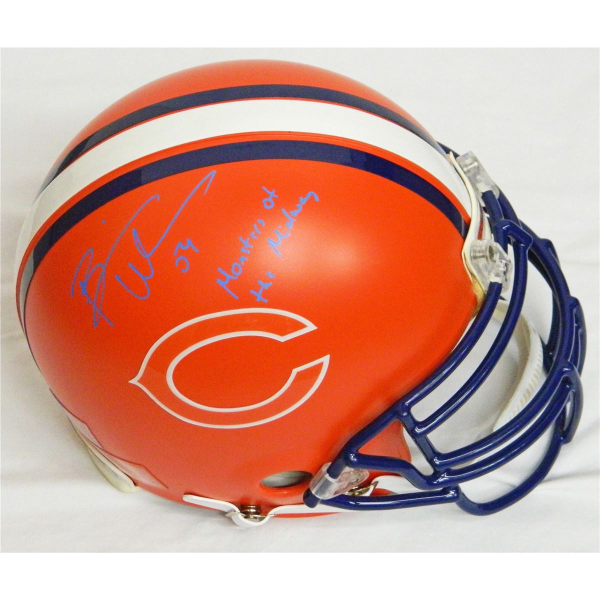 Brian Urlacher signed Chicago Bears custom orange matted authentic pro helmet with 'Monsters of the Midway' inscription. Item comes with a Schwartz Sports Memorabilia tamper-proof numbered hologram and Certificate of Authenticity which can be verified online.