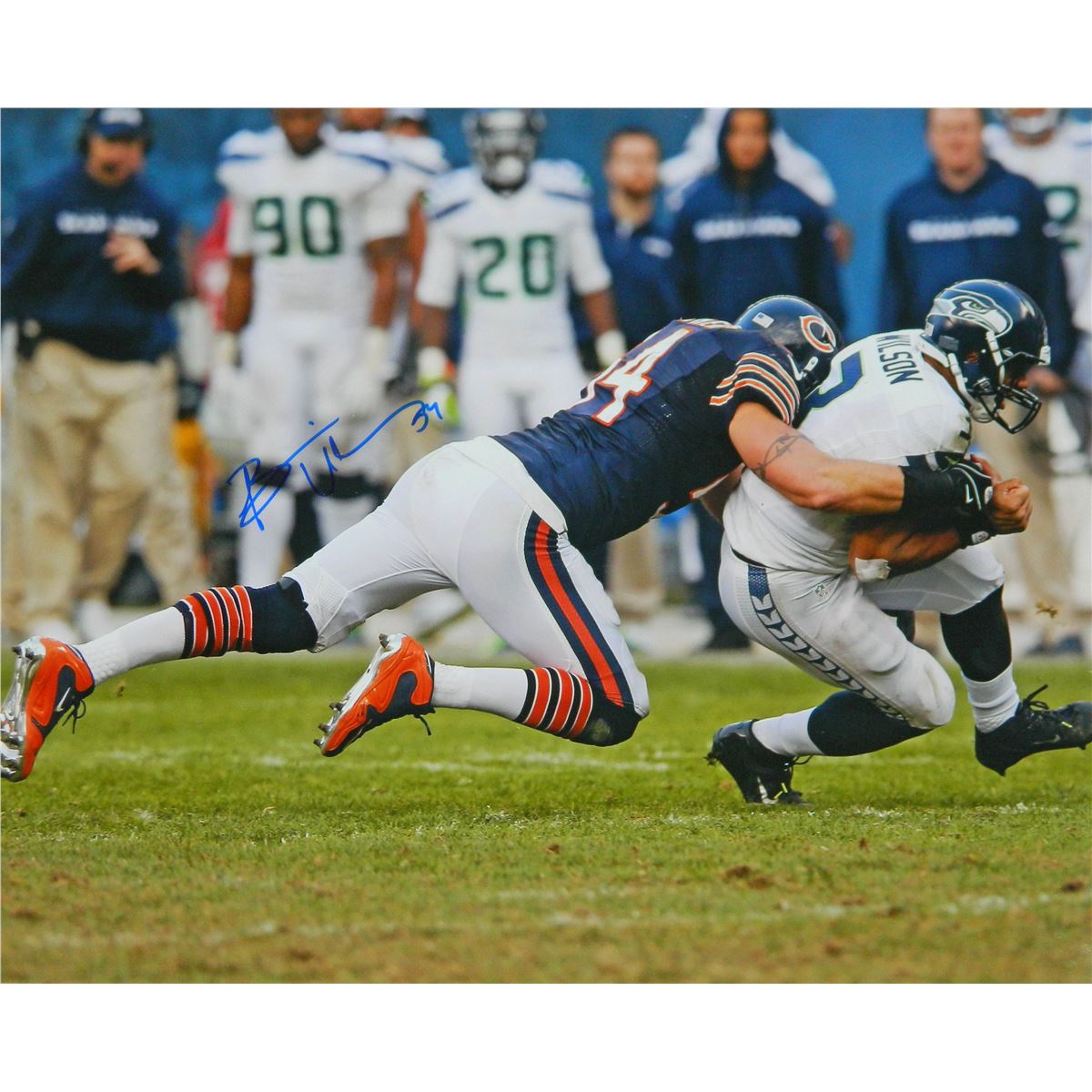 Brian Urlacher Signed Chicago Bears final career play action 16x20 photo against the Seahawks Russell Wilson. Item comes with a Schwartz Sports Memorabilia tamper-proof numbered hologram and Certificate of Authenticity which can be verified online.