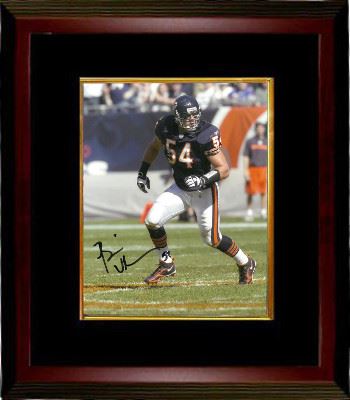 Brian Urlacher of the Chicago Bears was named 2000 NFL Rookie of the Year and never looked back. The talented middle linebacker has already tallied well over 1,000 tackles, is a perennial Pro Bowler, and in 2005 earned NFL Defensive Player of the Year honors. Brian Urlacher has signed this Chicago Bears 8x10 Photo. Certificate of Authenticity from Athlon Sports. Custom Black Mat and Premium Mahogany Frame as shown.