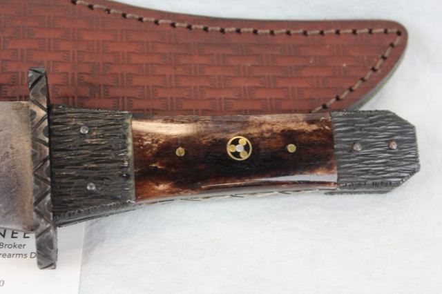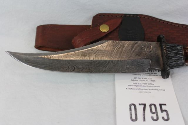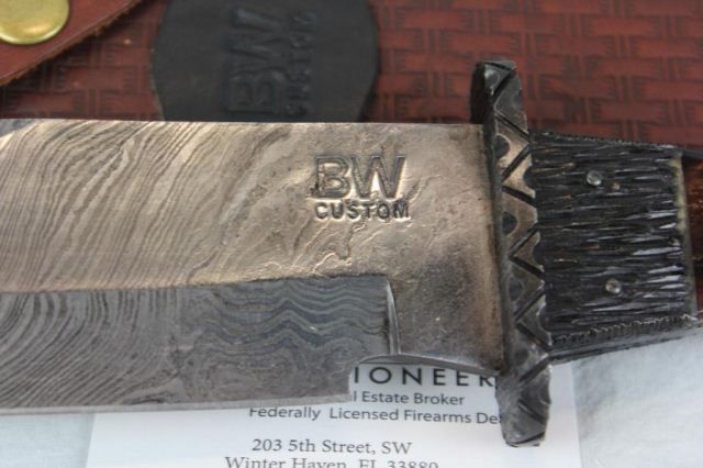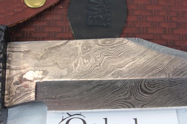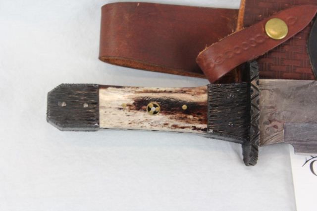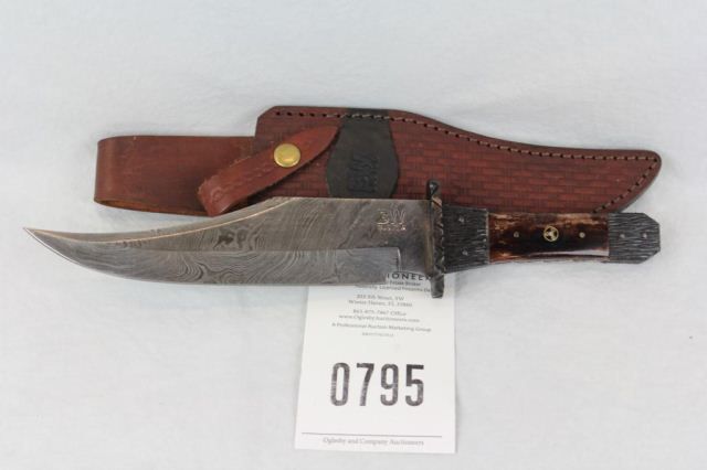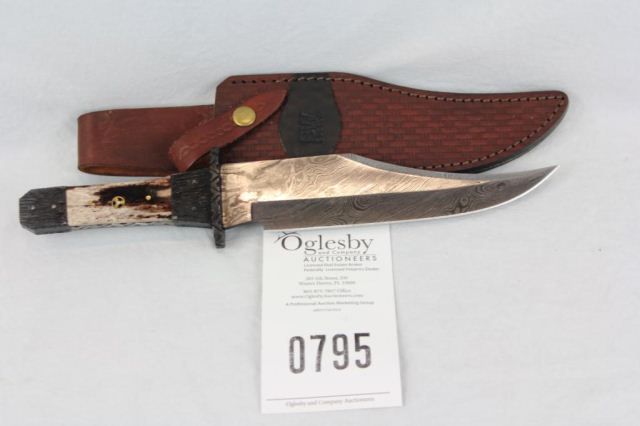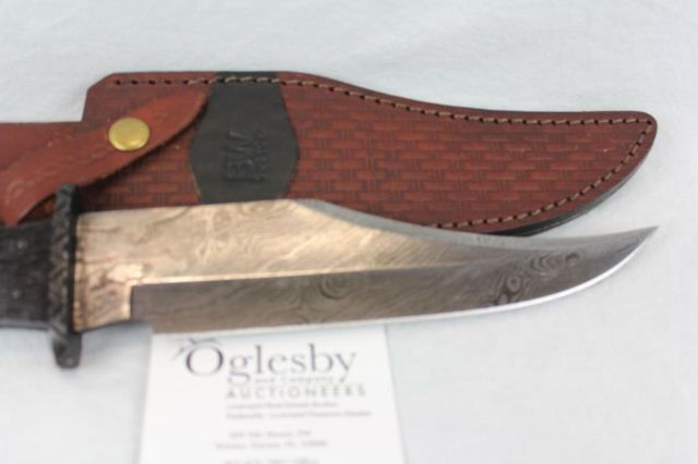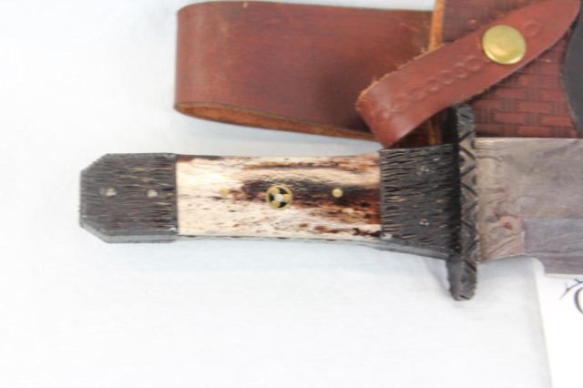 Custom Damascus blade Bowie knife by Brian Wilhoite whose work can be seen through Smokey Mountain Knife Works. 13.5" overall with 8.5" blade. Giraffe bone grip. Also comes with custom leather sheath.