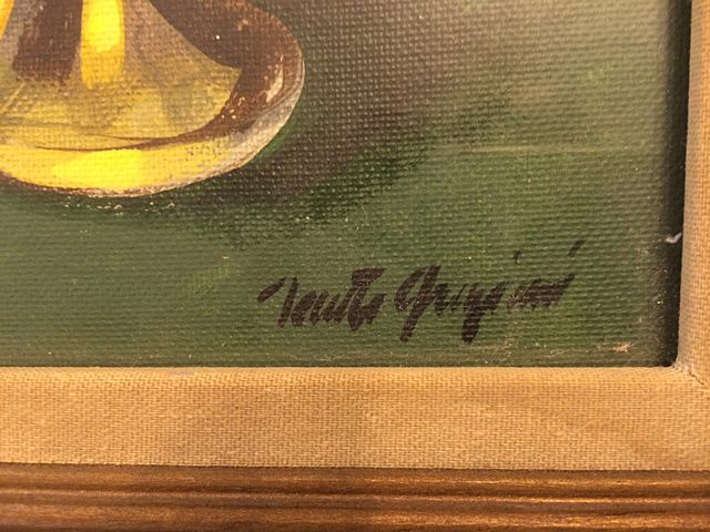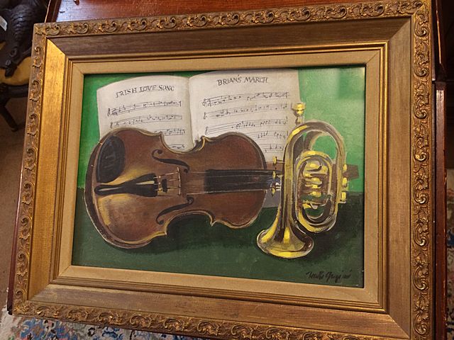 Brian's March, signed by Sante Graziani, 1987, painting in gold gilt frame, measures 14" x 18". Sante Graziani was a personal friend of the owner, many of his original works are offered from the in this auction. Sante Graziani (1920–2005) was an American artist and art educator. He was known for his murals, which adorned many public buildings. Graziani was educated at the Cleveland Institute of Art and later at Yale University. He met with success early in his career, winning the Pulitzer Traveling Scholarship in Art at the age of 22. Soon after military service in World War II, he began a career as an art educator. He taught at Yale University School of Art from 1946 to 1951. Graziani initially gained recognition for his murals. Among his works were a mural at the Holyoke (Mass.) Public Library and one at the Museum of Fine Arts in Springfield, Massachusetts. In the years around the United States bicentennial celebration in 1976, he produced paintings that included references to well known images of George and Martha Washington. He was commissioned to paint a colorful and decorative mural featuring an image of George Washington on the side of a building in Worcester, Massachusetts, in that era.