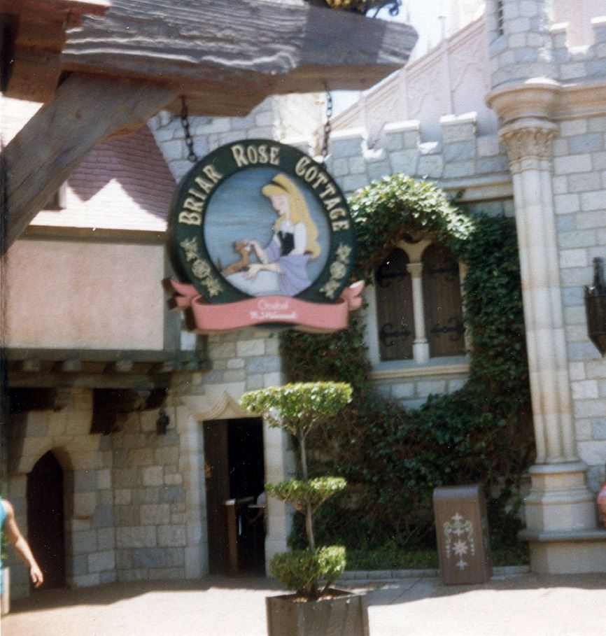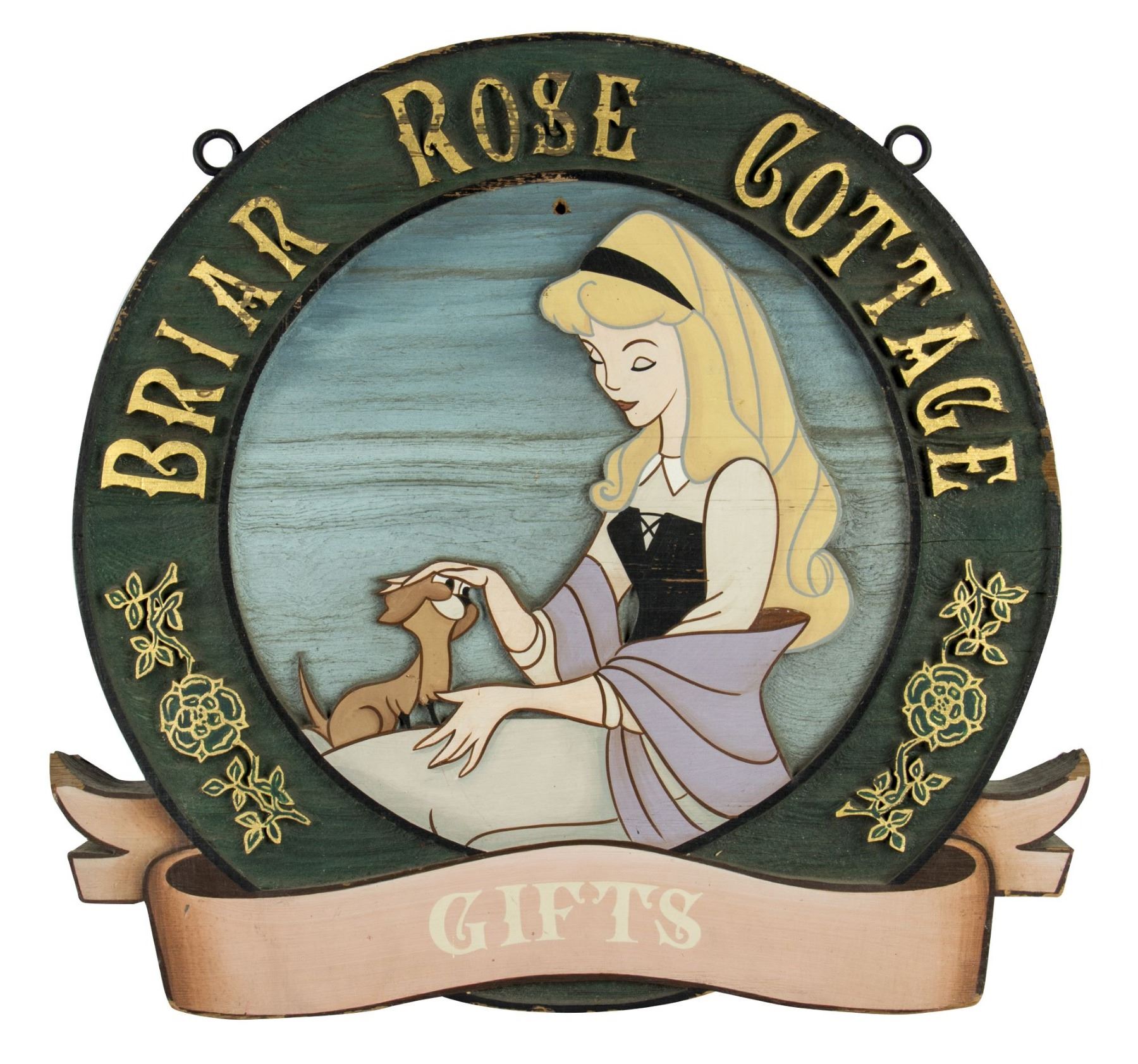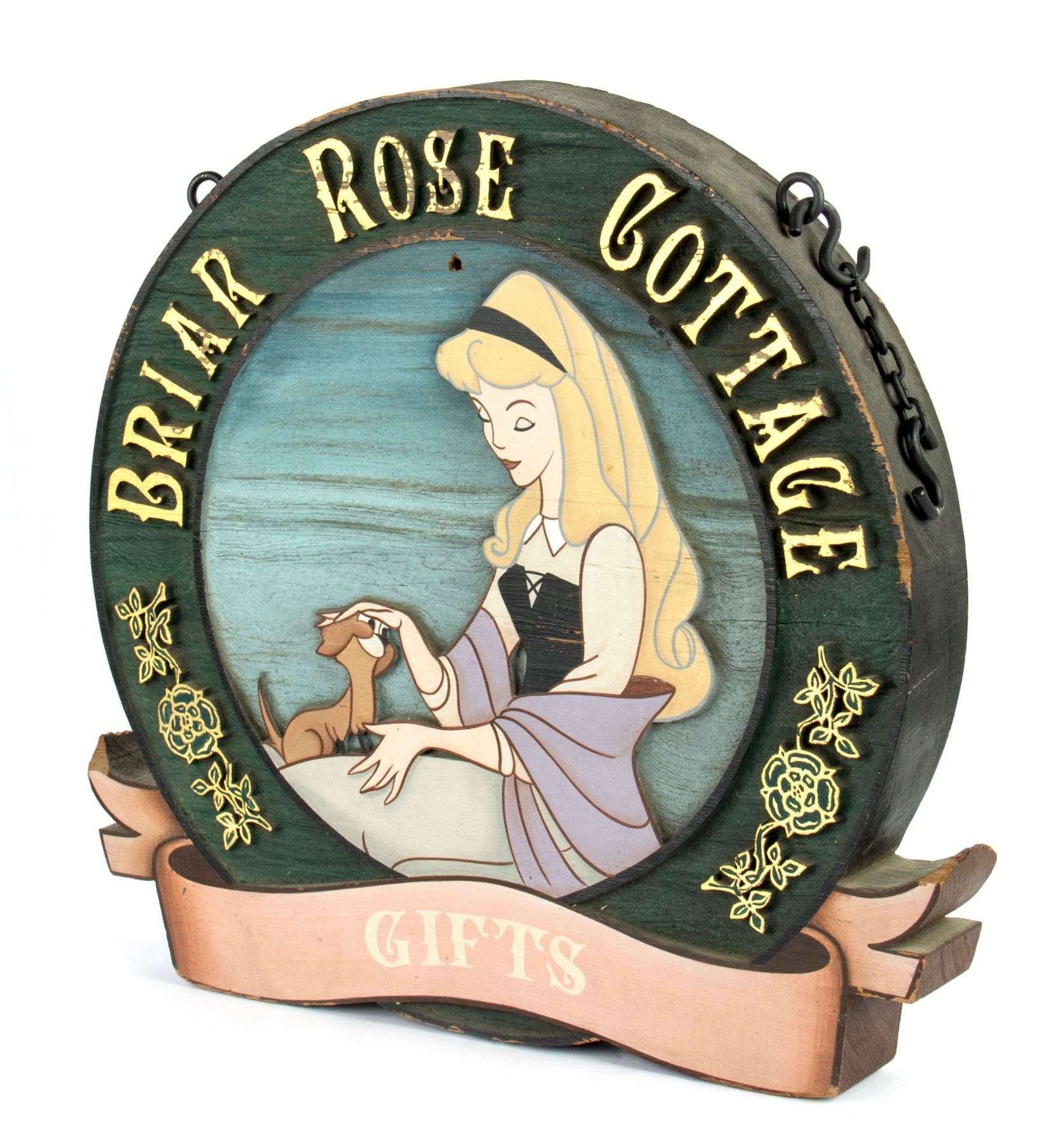 (Disneyland, 1987-91) An entrance sign from the Fantasyland shop "Briar Rose Cottage" which sold assorted figurines and collectibles between 1987 and 1991. This beautiful double-sided wooden sign features imagery of Briar Rose from "Sleeping Beauty" and prominently displays the name of the store. Original signs from shops and attractions are among the most sought-after Disneyland collectibles, with this sign containing fantastic imagery and color. The sign measures 21"x20" and 2.5" thick, and is in very good condition with minor edge-wear from use.