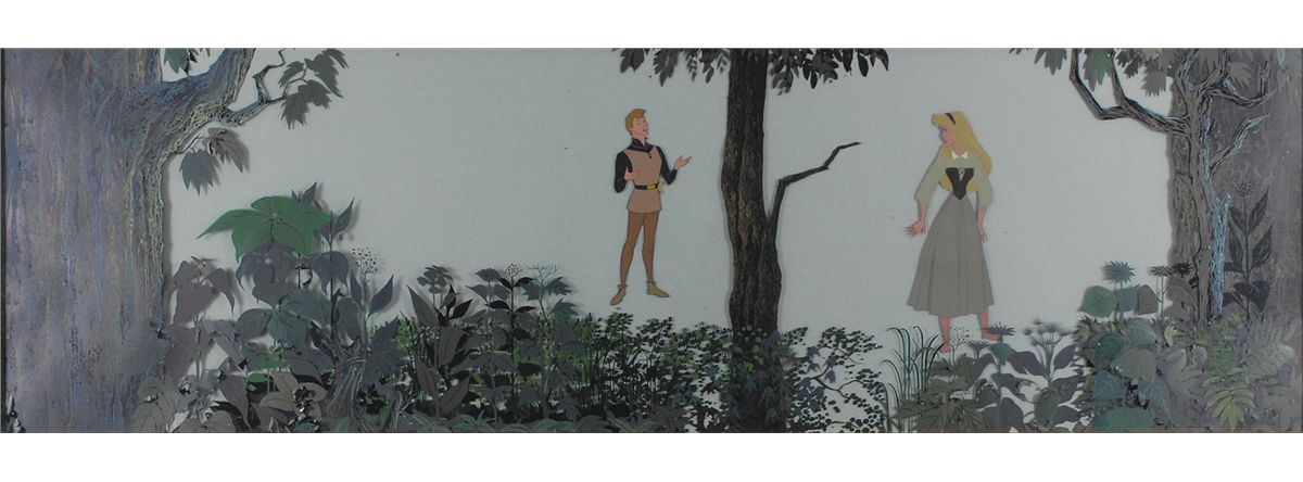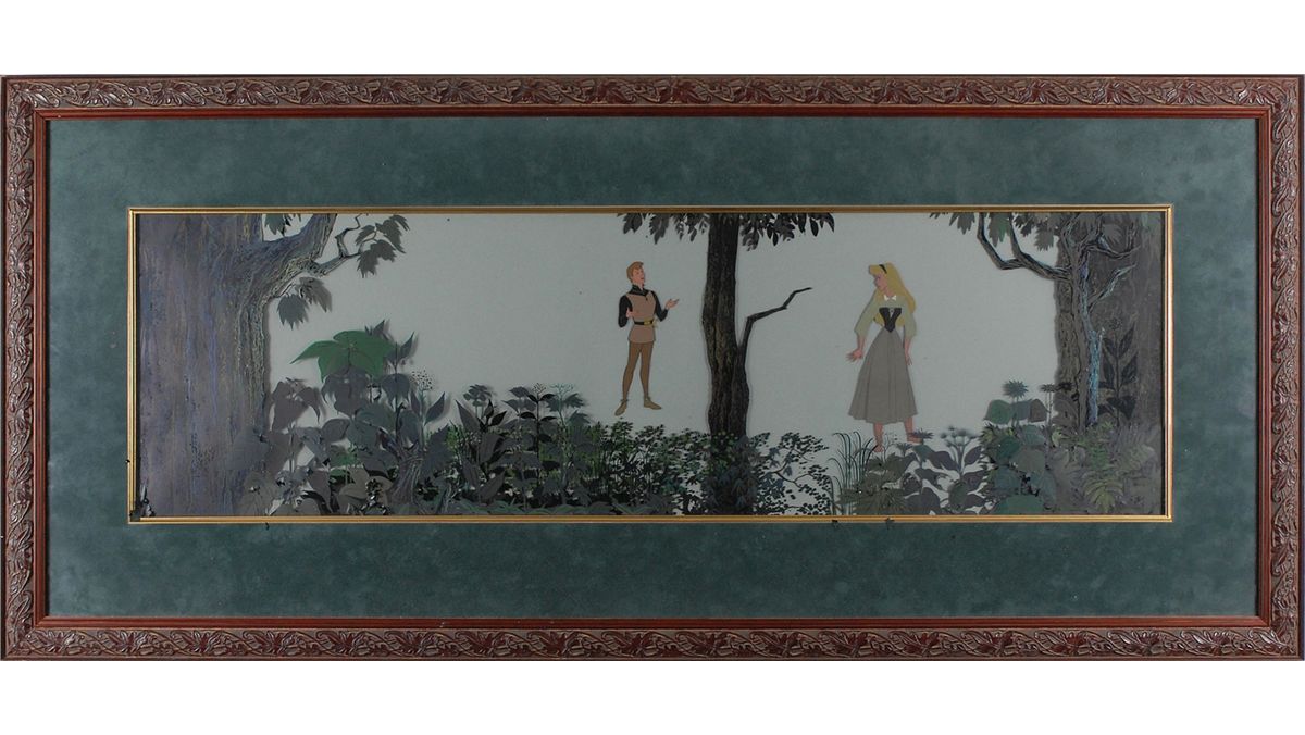 (Walt Disney Studios, 1959) Original pan production cels and pan background featuring Briar Rose and Prince Phillip from Sleeping Beauty, showing them falling in love during the ‘Once Upon a Dream’ sequence. The setting is comprised of three hand-painted background cels assembled for multi-plane purposes of depth, with overlays painted in gouache by master background painter artist Eyvind Earle. Images measure 2 x 5 and 2.5 x 6, with a mat opening of 33 x 9.75. This piece is also framed to an overall size of 42.5 x 19. In very good condition, with some flaking and damage to overlays.