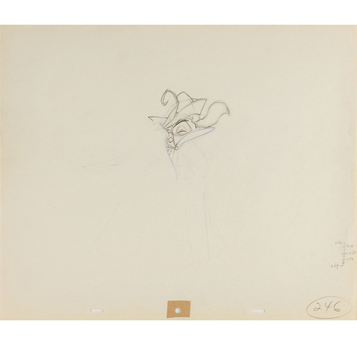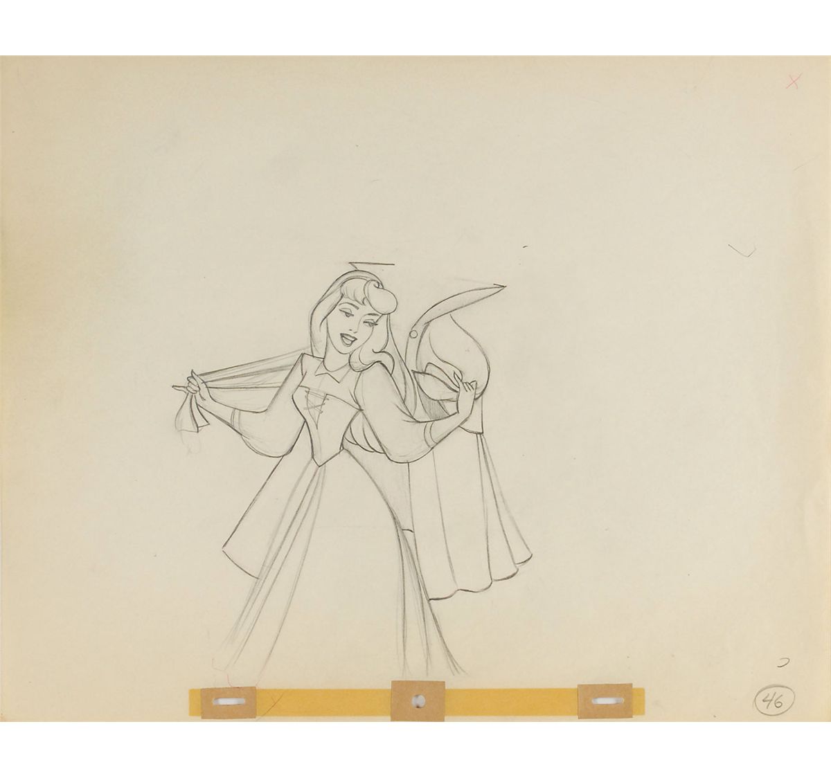 (Walt Disney Studios, 1959) Original matched set of two production drawings featuring Briar Rose and the Mock Prince from Sleeping Beauty. Accomplished in graphite on two sheets of untrimmed 15.5 x 12.5 animation paper. The boldly-pencilled Briar Rose, drawn by Marc Davis, measures 6 x 8, with the ‘prince,’ drawn by John Lounsberry, measuring approximately 3.5 x 4.5. In fine condition.