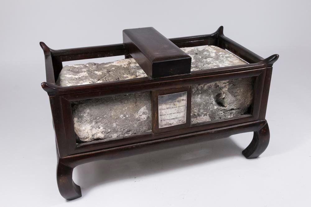 In standing frame. With plaque "This brick from the Great Wall of China once separating peoples is now used as an emblem of International Fellowship." Approx. 9 1/2" x 19 1/2". Property from the collection of Hank Willoughby, Allenwood, NJ. "When the Elizabeth, N.J., Rotary Club suggested a brick from the Great Wall of China for a gavel stand, Shanghai Rotarians responded with alacrity. The brick was sent immediately, and President Fong who is traveling in the United States will make the formal presentation to the Elizabeth club."