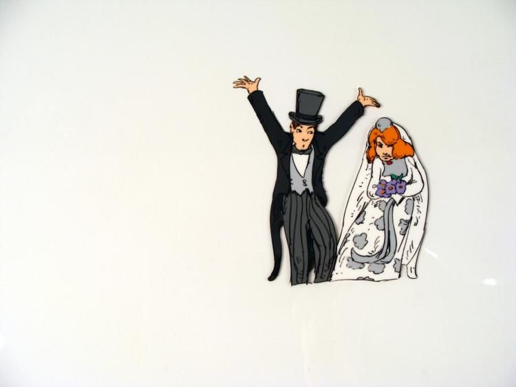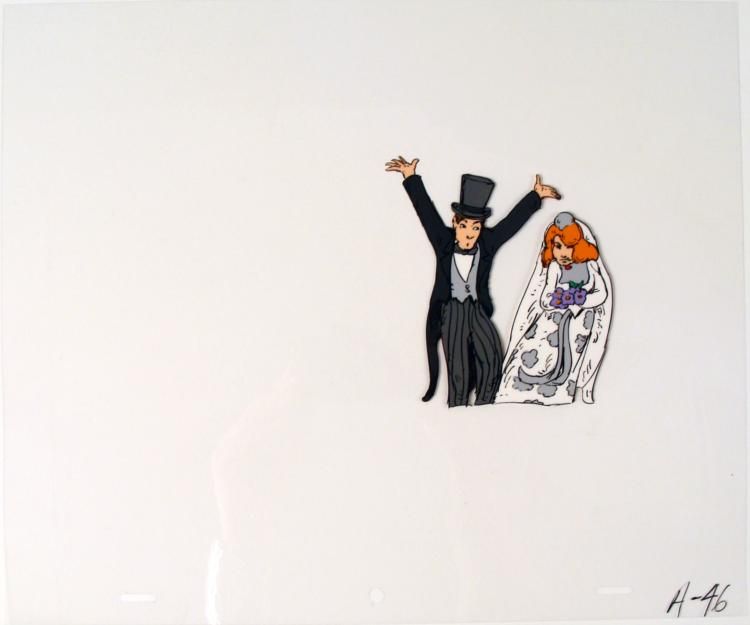 This is an original animation cel of a bride and groom. * * * * A word to the wise gentleman, don't do this on your wedding night (referring to the photo). * * * Medium: Hand painted acetate cel * * Cel size: 10 1/2" x 12 1/2" * * Notations: Bottom of cel * * Condition: Excellent