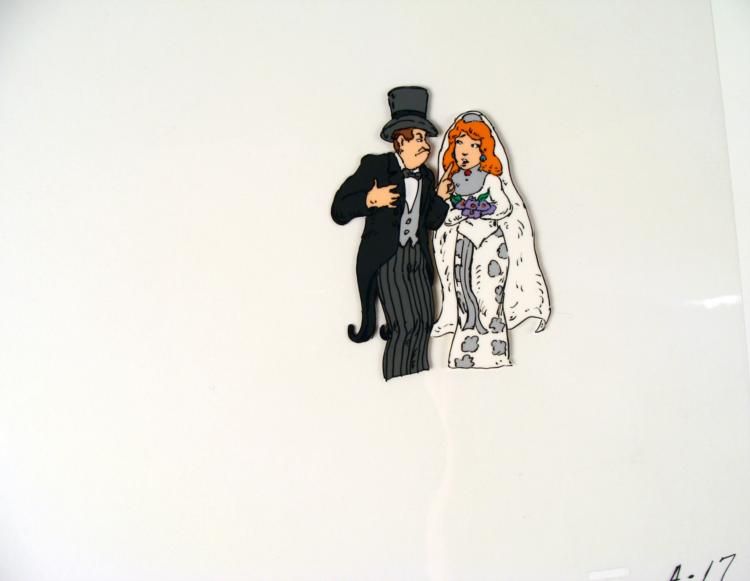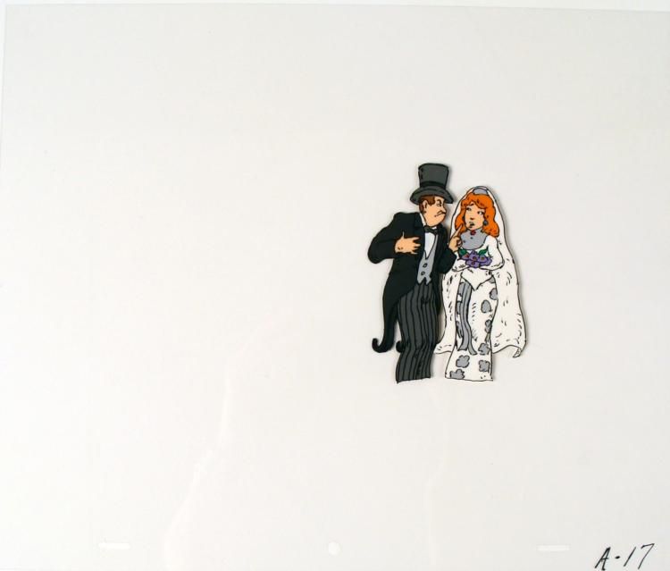 This is an original animation cel of a bride and groom. If I had to repeat myself one more time, just one more time, so help me god... Medium: Hand painted acetate cel Cel size: 10 1/2" x 12 1/2" Notations: Bottom of cel Condition: Excellent **The cel received by the winning bidder may be ever so slightly different from that in the auction photo.