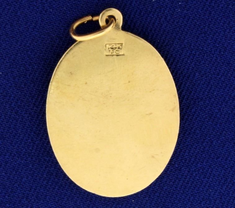 In 14k rose gold, 1 1/4" long with bale. Bank is blank for personalized inscription. 3.0g.