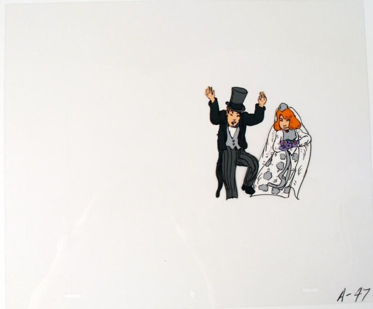 This is an original animation cel of a bride and groom. * * * * Brace yourself, it's going to be okay. I don't believe he's that dumb to get violent with you on our wedding night, or is he?!?!? * * * Medium: Hand painted acetate cel * * Cel size: 10 1/2" x 12 1/2" * * Notations: Bottom of cel * * Condition: Excellent