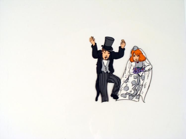 This is an original animation cel of a bride and groom. * * * * Brace yourself, it's going to be okay. I don't believe he's that dumb to get violent with you on our wedding night, or is he?!?!? * * * Medium: Hand painted acetate cel * * Cel size: 10 1/2" x 12 1/2" * * Notations: Bottom of cel * * Condition: Excellent