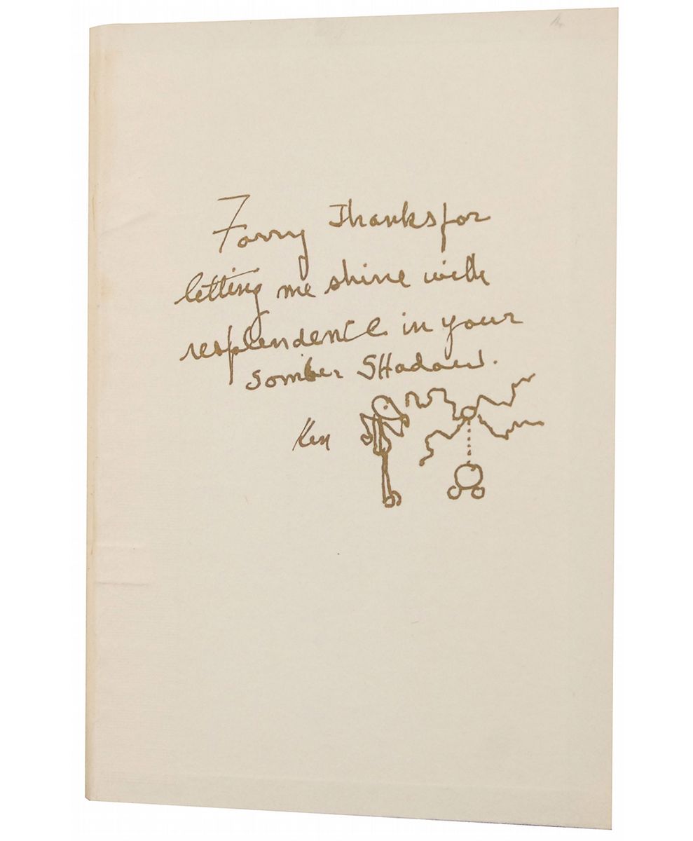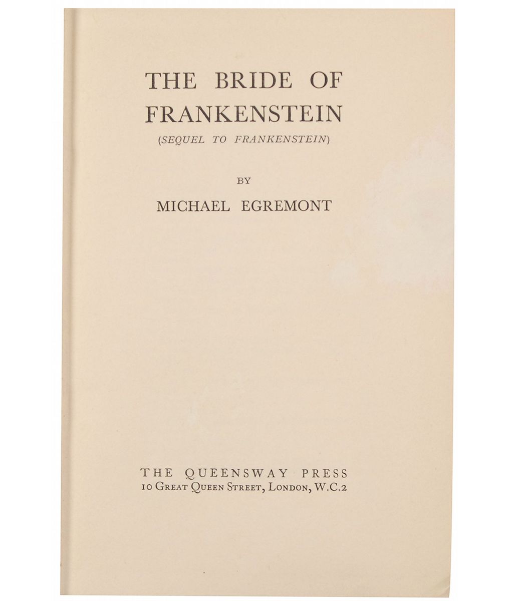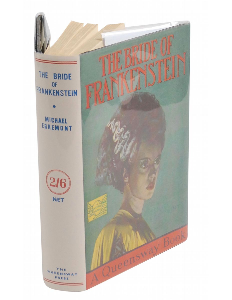Set designer and electrical special effects creator (1896–1984) whose work appeared in more than 100 films and television shows including Frankenstein, The Wizard of Oz, and The Munsters. Signed book: The Bride of Frankenstein. London: Queensway Press, undated [circa 1936]. Hardcover with reproduction dust jacket, 5.5 x 7.75, 252 pages. Signed and inscribed on the rear pastedown to noted science fiction enthusiast Forrest Ackerman, “Forry, thanks for letting me shine with resplendence in your somber shadow, Ken,” adding a sketch of a person staring at a laboratory device emitting bolts of electricity. Autographic condition: fine. Book condition: G+/F (reproduction). Any signed sketch from Strickfaden is uncommon; the direct association to the renowned Ackerman elevates this book into the upper echelon of horror and science fiction collectibles.