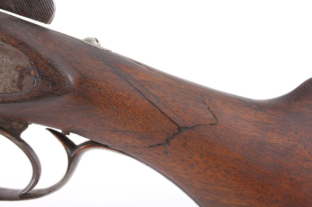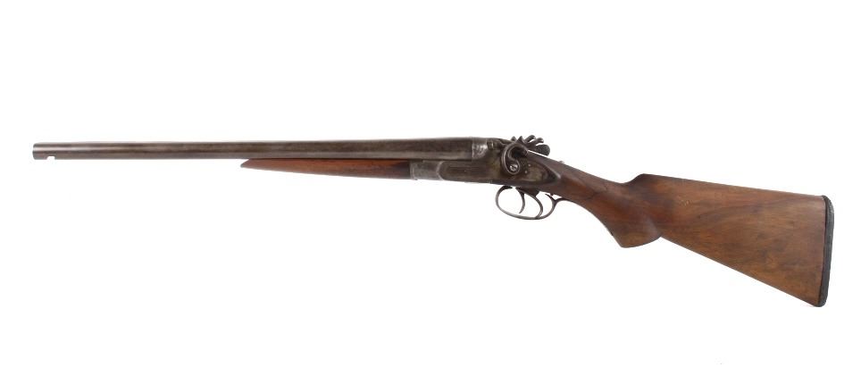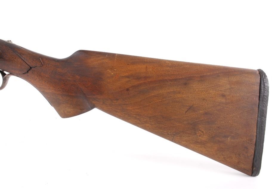 Available to you in this lot is a Bridge Gun Company, side by side, coach gun, chambered in 16 gauge. The firearm originates from around 1880 - 1914. The shotgun utilizes a 18 1/2" solid ribbed, Damascus barrel, external hammers, and a walnut fore-grip and stock. Additionally, the shotgun has 2 3/4" chambers, and a 13 3/4" length of pull. The Shotgun is marked on the bottoms of the barrel, and the barrel flats with numerous Belgian proof marks, as well, the shotgun is etched on the top of the barrel rib with; "Oxford Damascus Belgium". The left lock plate is etched with "Bridge Gun Co., while the fore-grip is marked with the firearm serial number: "2348", and "II - 19". The shotgun shows fair condition overall, with fair mechanics, and aesthetic condition, The grip has a large crack. The shotgun qualifies as a Curio & Relic. FFL Transfer or NICS Background Check is required. Serial Number: 2348.