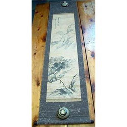The empty spaces and melancholy air of this gorgeous landscape are traits of Shoninpa's style. He masterfully employs a great vocabulary of brushstrokes here. Mount: 75 x 17.5 inches, 190.5 x 44.5 cm. Painting: 51.5 x 13 inches, 131 x 33 cm