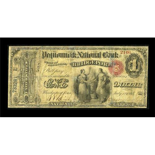 <B>Bridgeport, CT</B></I> - $1 Original Fr. 380 <B>The Pequonnock NB</B></I> Ch. # 928<BR> Despite ten notes being known from this bank, this is the first appearance of any kind for nearly a decade. This piece faces up well, but was helped a little. Professional restoration is noted on the edges and along the heavy folds. <B>Good.</B></I> <BR><BR><b>Shipping:</b> Coins & Currency (<a target="_blank" href="http://www.heritageauctions.com/common/shipping.php">view shipping information</a>)
