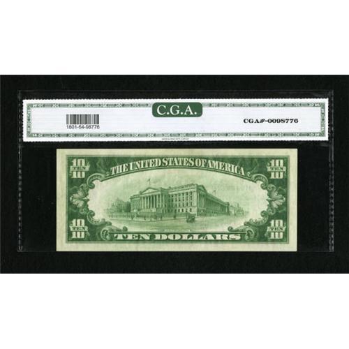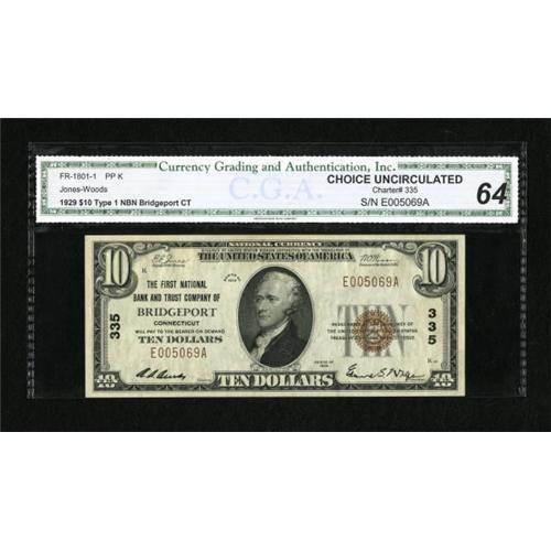 <B>Bridgeport, CT</B></I> - $10 1929 Ty. 1 <B>The First NB & TC</B></I> Ch. # 335<BR> A well margined example from this fourth title issuer. <B>CGA Choice Uncirculated 64</B></I>.<BR><BR><b>Shipping:</b> Coins & Currency (<a target="_blank" href="http://www.heritageauctions.com/common/shipping.php">view shipping information</a>)