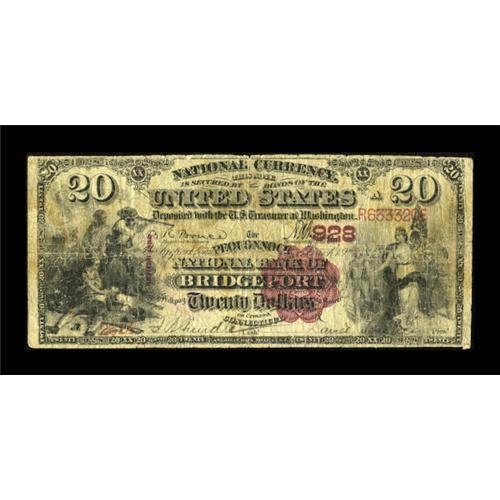 <B>Bridgeport, CT</B></I> - $20 1882 Brown Back Fr. 494 <B>The Pequonnock NB</B></I> Ch. # 928<BR> Another rare Bridgeport note, with this one of only two Brown Backs reported from here, and the only $20. We note no offerings of any kind since our Connecticut sale in January of 1998. Well circulated but intact <B>Very Good.</B></I><BR><BR><b>Shipping:</b> Coins & Currency (<a target="_blank" href="http://www.heritageauctions.com/common/shipping.php">view shipping information</a>)