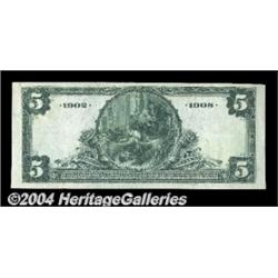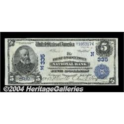 Bridgeport, CT - $5 1902 Date Back Fr. 591 The First-Bridgeport NB Ch. # (N)335A lovely Date Back which is one center fold from new. About Uncirculated. <BR><BR><B>Important notice:</B> Heritage usually auctions material at the rate of 200-250 lots per hour. On some occasions eBay Live bid software or the Internet may not be able to keep up with the pace of the auction. We recommend placing a realistic absentee bid now as insurance to avoid disappointment. Occasionally the auctioneer may eliminate or reject an eBay Live bid, and the auctioneer may also reopen a lot after the close of the eBay live bidding (usually because we missed an audience bid), and may reject your bid even if it shows you as the winning bidder. By bidding via eBay Live, you agree that Heritage may award the lot to another bidder at its sole discretion under the circumstances described above or any other reasonable circumstances. Since eBay bids are not shown to us until we open the lot on the floor, we treat those bids just like floor bids. In most cases the floor responds before the eBay bid is presented to us, due to Internet lag time, so for consistency we have made it a policy that floor bids are always considered first over tie eBay live bids. Also please note that all Heritage lots purchased through eBay Live carry a 20% Buyer's Premium. Please make sure you read the Terms and Conditions before you bid. <BR><BR><B>IMPORTANT ANNOUNCEMENT ABOUT RESERVES:</B> Heritage now divulges all reserves on its web site 7 days before every auction. If you want to know whether the reserve on this lot has been met, and if not, what the reserve amount is, please visit this lot page on the HeritageCoin.com web site, or email: bid@HeritageGalleries.com