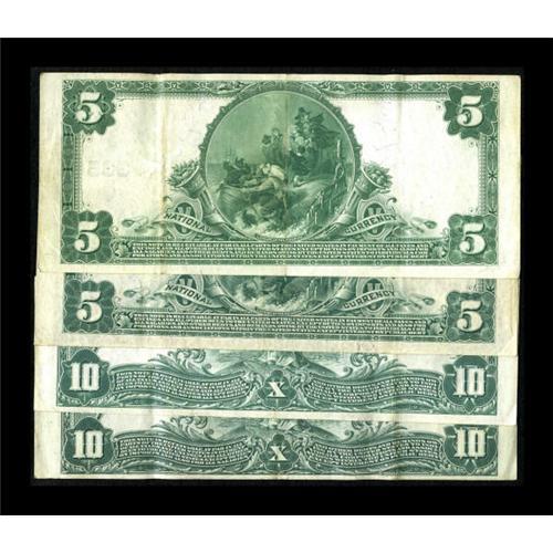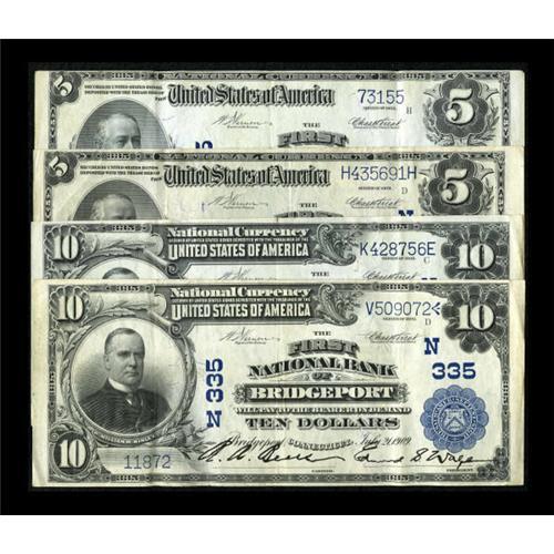<B>Bridgeport, CT</B></I> - $5 1902 Plain Backs Fr. 600 <B>The First NB</B></I> Ch. # 335 Two Examples<BR><B>Bridgeport, CT</B></I> - $10 1902 Plain Backs Fr. 626 <B>The First NB</B></I> Ch. # 335 Two Examples<BR> One of the $5 notes has a geographic sort letter while the other does not. Both $10 notes carry geographic letters. All the notes are about in the same pleasing grade of <B>Very Fine-Extremely Fine</B></I> with plenty of crispness.<BR><BR><b>Shipping:</b> Coins & Currency (<a target="_blank" href="http://www.heritageauctions.com/common/shipping.php">view shipping information</a>)