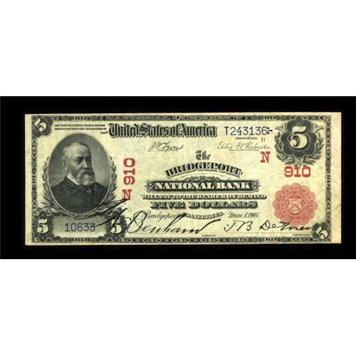 <B>Bridgeport, CT</B></I> - $5 1902 Red Seal Fr. 587 <B>The Bridgeport NB</B></I> Ch. # (N)910<BR> A very scarce note from a Bridgeport bank which went out in 1909. Track and Price reports only four appearances at public sale since 1993, with three of that number coming in our landmark Connecticut offering in January of 1998. In fact, there has not been a single appearance of any kind from here in the past decade. This new to the census Red Seal is both pretty and problem free, with bold colors and strong jet black signatures. <B>Fine-Very Fine.</B></I> <BR><BR><b>Shipping:</b> Coins & Currency (<a target="_blank" href="http://www.heritageauctions.com/common/shipping.php">view shipping information</a>)
