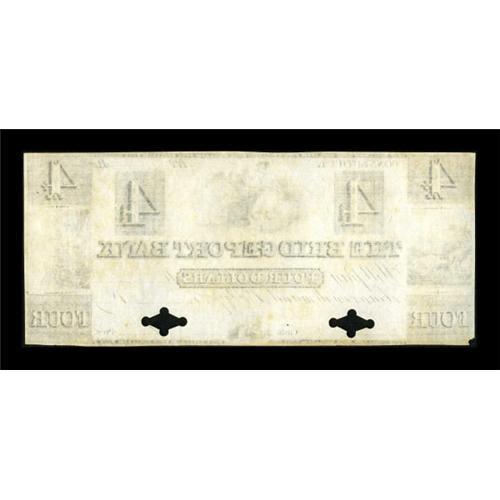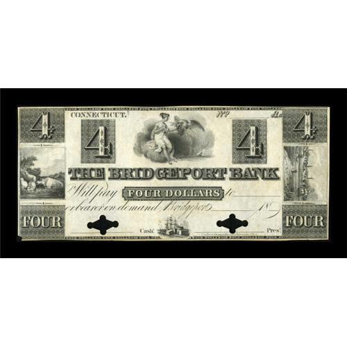 <B>Bridgeport, CT- The Bridgeport Bank</B></I> $4 G72 Proof<B></B></I><BR> An excessively rare odd denomination Connecticut Proof. A tiny corner tip is missing at the bottom left, which affects nothing. <B>Uncirculated,</B></I> with two POC, a great item worthy of the finest of collections. <BR><BR><b>Shipping:</b> Coins & Currency (<a target="_blank" href="http://www.heritageauctions.com/common/shipping.php">view shipping information</a>)