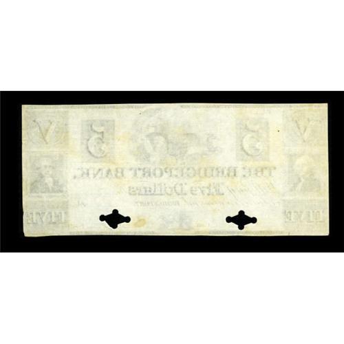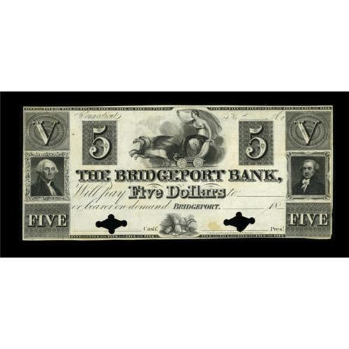 <B>Bridgeport, CT- The Bridgeport Bank</B></I> $5 UNL Proof<BR> There is no description in the Haxby reference for any $5 note that resembles this Proof example. <B>Uncirculated,</B></I> with two POC, a rare and perhaps unique item. <BR><BR><b>Shipping:</b> Coins & Currency (<a target="_blank" href="http://www.heritageauctions.com/common/shipping.php">view shipping information</a>)