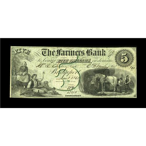 <B>Bridgeport, CT- The Farmers Bank</B></I> $5 Nov. 1, 1860 G16b<BR>An extremely scarce note which has everything a collector of obsolete notes could desire. This late issue American Bank Note Company product is fully green tinted, offers two attractive vignettes, and comes from a bank which eventually became the First National Bank of Bridgeport. Sharp <B>Very Fine.</B></I><BR><BR><b>Shipping:</b> Coin/Currency (<a target="_blank" href="http://www.heritageauctions.com/common/shipping.php">view shipping information</a>)
