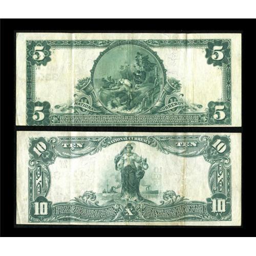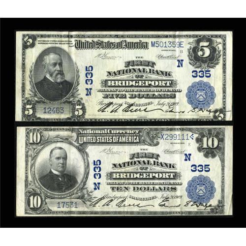 <B>Bridgeport, CT</B></I> - <B>A Perfectly Matched Pair</B></I><BR> $5 1902 Plain Back Fr. 600 <B>The First NB</B></I> Ch. # (N)335,<BR>and a $10 1902 Plain Back Fr. 626 <B>The First NB</B></I> Ch. # (N)335.<BR>This pair was stored together after being folded in three, unfolded, and set aside for today's collectors. <B>Very Fine.</B></I><BR><BR><b>Shipping:</b> Coins & Currency (<a target="_blank" href="http://www.heritageauctions.com/common/shipping.php">view shipping information</a>)
