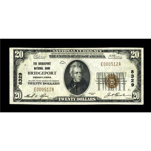 <B>Bridgeport, PA</B></I> - $20 1929 Ty. 1 <B>The Bridgeport NB</B></I> Ch. # 8329<BR>Just five of the $20 1929 Ty. 1 are verified in the census from here, including this bright <B>Very Fine</B></I> that retains virtually all of its original crispness. This was the only issuing bank located in this small Montgomery County locale.<BR><BR><b>Shipping:</b> Coin/Currency (<a target="_blank" href="http://www.heritageauctions.com/common/shipping.php">view shipping information</a>)