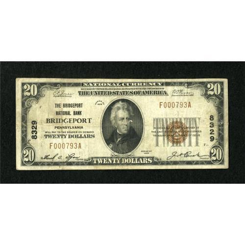 <B>Bridgeport, PA</B></I> - $20 1929 Ty. 1 <B>The Bridgeport NB</B></I> Ch. # 8329<BR> A few pinholes are noticed on this nicely margined note. <B>Fine.</B></I><BR><I>From The Kansas City Collection</B></I><BR><BR><b>Shipping:</b> Coins & Currency (<a target="_blank" href="http://www.heritageauctions.com/common/shipping.php">view shipping information</a>)