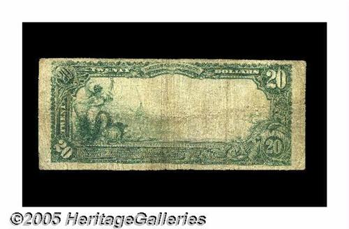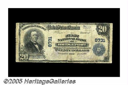 <B>Bridgeport, TX</B></I> - $20 1902 Plain Back Fr. 652 <B>The First NB </B></I> Ch. # 8731<BR>A very scarce north Texas bank, especially in large size, where the Kelly census population consists of just four examples, one of which is permanently impounded in the Moody holdings. <B>Very Good-Fine,</B></I> with a couple of minor pinholes.