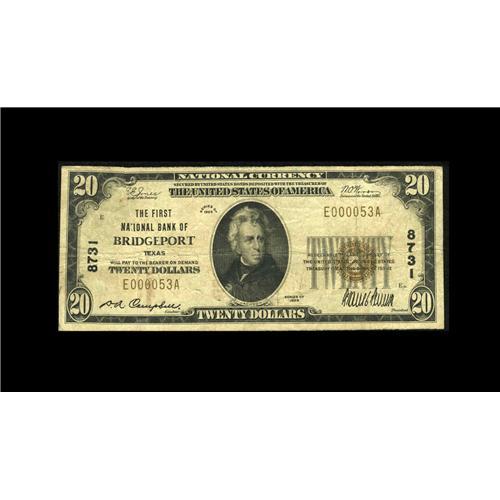 <B>Bridgeport, TX</B></I> - $20 1929 Ty. 1 <B>The First NB</B></I> Ch. # 8731<BR>A tough noe from the only bank to issue in this small north Texas community. <B>About Fine.</B></I>