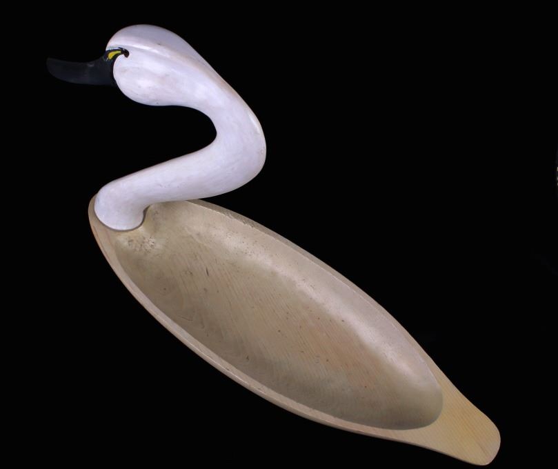 For your consideration is this hand carved swan centerpiece by Bridger Trading Co. The swan shows a great life like design and decoration with a large carved bowl body; the swan is painted and has a Bridger Trading Co. mark on the bottom of the centerpiece. The condition of this centerpiece is good with no obvious signs of damage with cloth feet to keep it from scratching the table; there are scuff marks to the inside of the bowl. The measurements of this centerpiece 17" x 8 3/4" x 25 1/2".