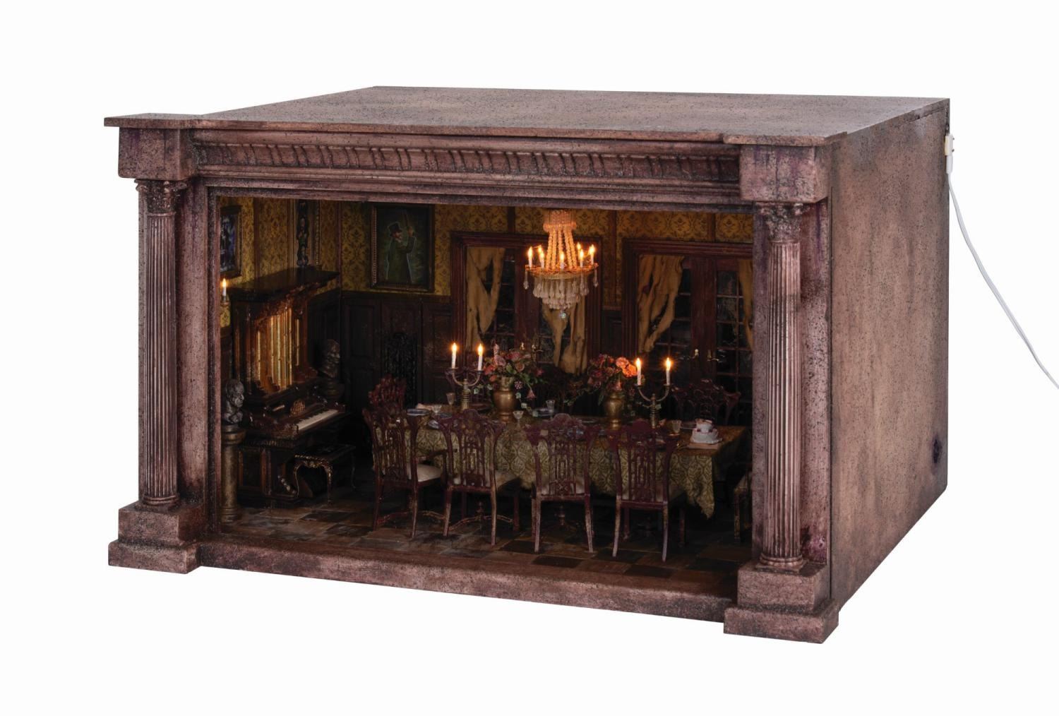 (McCarty, 2021) A hand-crafted miniature model of the Haunted Mansion's iconic ballroom by artist Bridget McCarty. This painstakingly detailed miniature scene features numerous details throughout that Haunted Mansion fans are sure to instantly recognize, including the famous dueling portraits, Sam McKim's Haunted Mansion concept artwork, the ghostly pipe organ, a stretching portrait, and menacing busts, among others. This mixed-media model has small lighted elements when plugged in, and a push-button activates simulated lightning and thunder noises at the back windows. The model is contained within a wooden box frame with a removable front glass panel. Measuring 13"x21.25" and 18" deep within its wooden box, the miniature is in very fine condition. Due to the very delicate nature of this item, special shipping arrangements may apply. Please inquire before bidding for additional details and estimates.