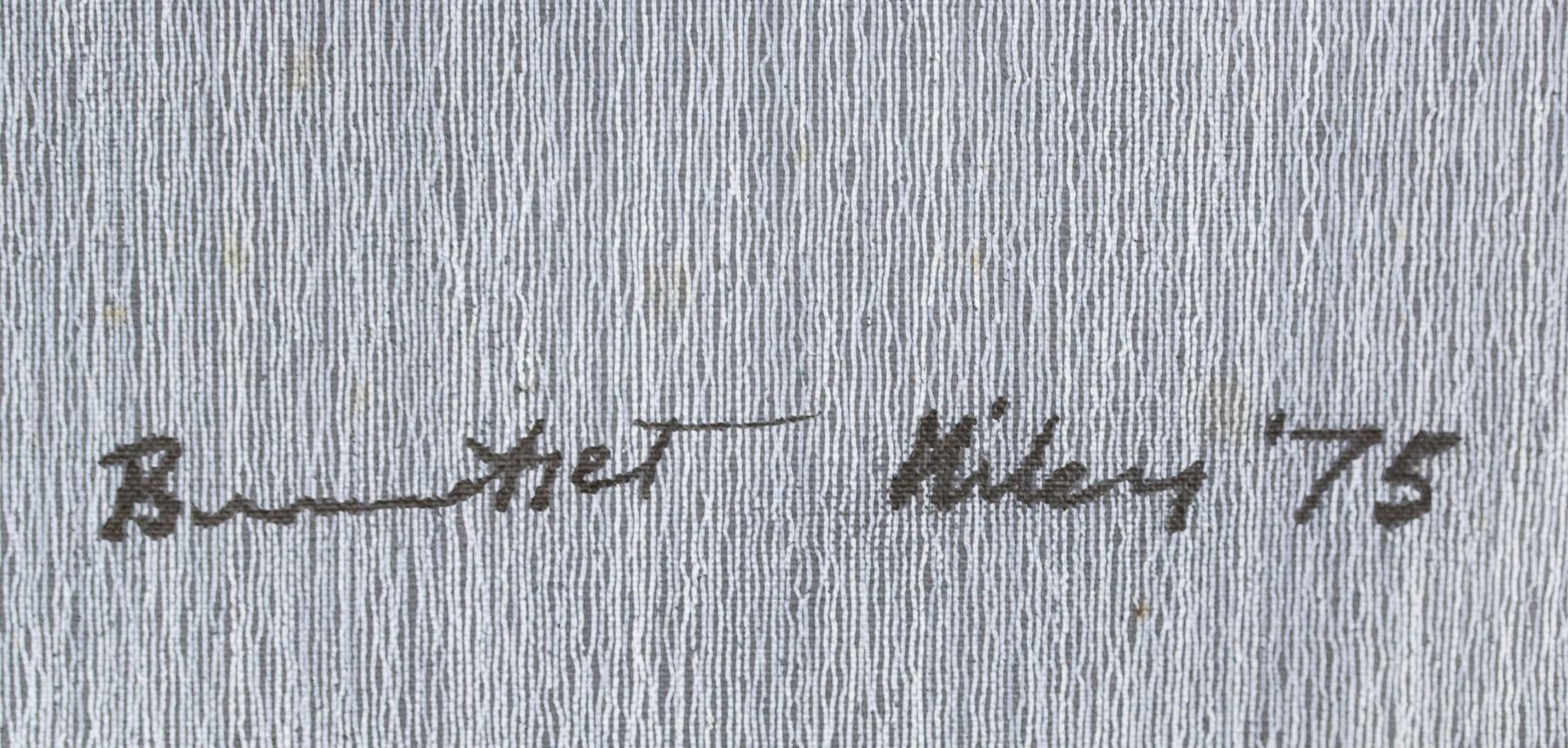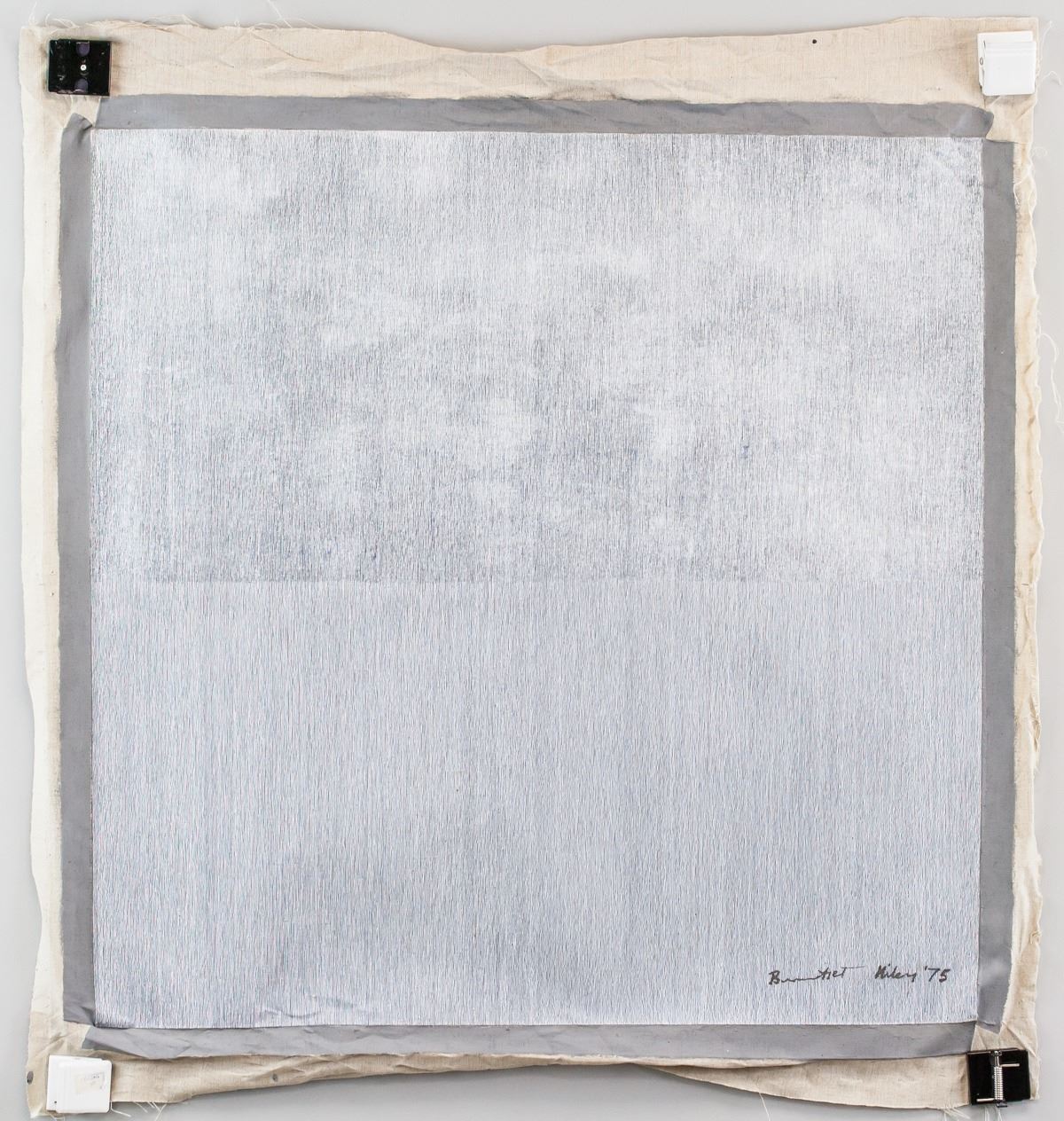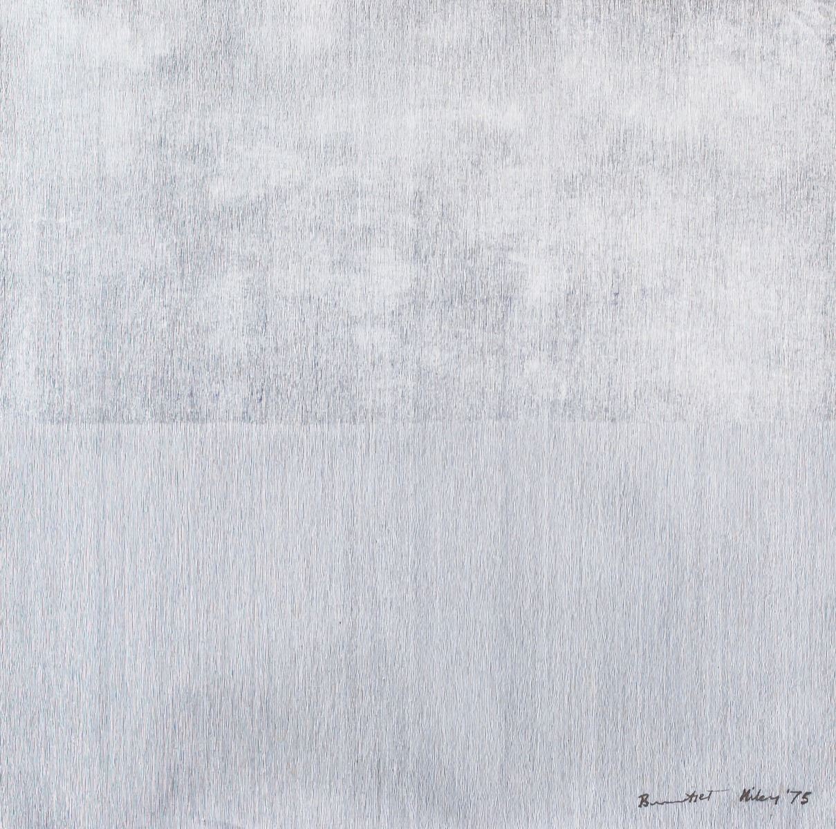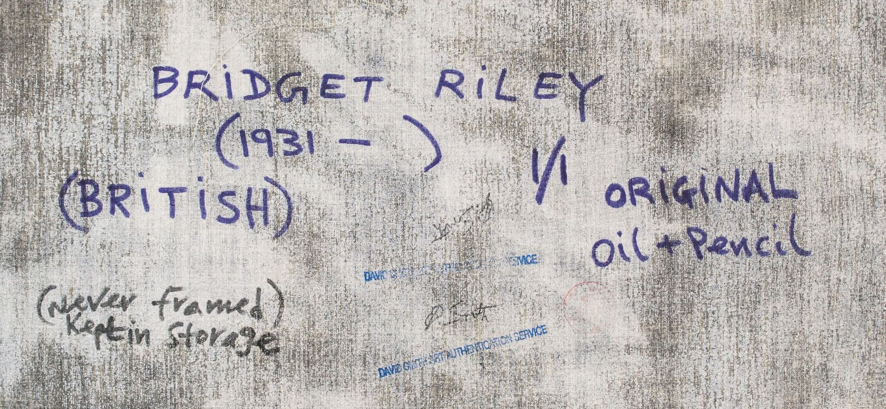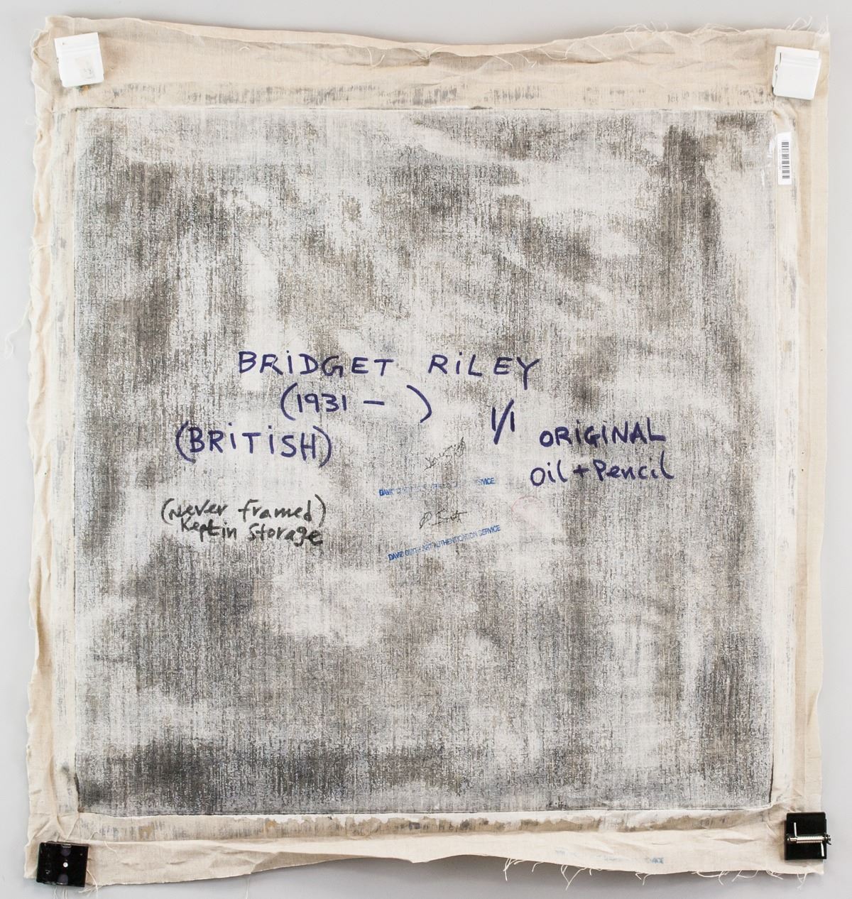 Acyrlic on canvas. Featuring gray composition. Signed "Bridget Riley" in the bottom right corner, with "75" inscribed beside the signature. "BRIDGET RILEY (1931- ) (BRITISH) 1/1 ORIGINAL Oil + Pencil (Never framed) kept in storage" inscribed on verso. Stamped with "DAVID SMITH ART AUTHENTICATION SERVICE" on verso, accompanied by signature. Attributed to Bridget Riley (1931- , British). 61 x 61 cm (24 x 24 inches).
