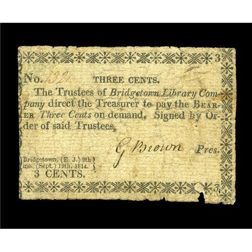 <B>Bridgetown, NJ- Bridgetown Library Company</B></I> 3¢ Sept. 19, 1814 Wait 199<BR>A very rare early New Jersey note listed as R-7 in Wait. Nice <B>Fine,</B></I> with a tiny chip out of the bottom border.