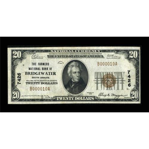 <B>Bridgewater, SD</B></I> - $20 1929 Ty. 1 <B>The Farmers NB</B></I> Ch. # 7426<BR> A truly rare note from the only bank to issue Series 1929 examples from this McCook County hamlet. Track and Price shows just one note offered from here in twenty years, with that a one time retail price list offering back in 2002. Only thirteen sheets of twenties were issued from here, along with 94 sheets of tens, making this a true miracle of survival. <BR><BR><b>Shipping:</b> Coins & Currency (<a target="_blank" href="http://www.heritageauctions.com/common/shipping.php">view shipping information</a>)