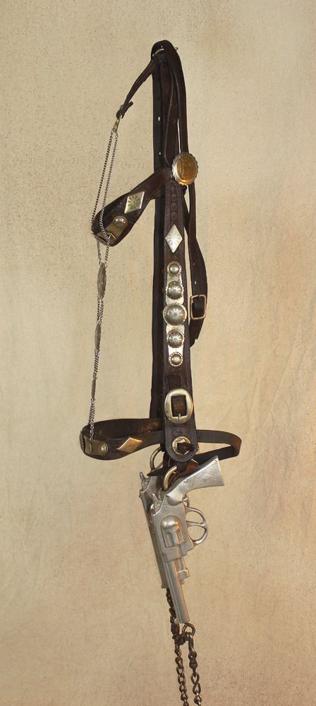 A terrific aluminum pistol bit with port mouthpiece. Accompanied by a wide cheek bridle, mounted with fancy designed polished stainless steel, and with a stylish facechain.
