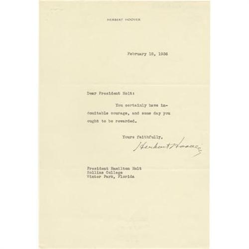 <B>Brief Herbert Hoover Typed Letter Signed</B></I> on his personal letterhead, 1 page, 7.25" x 10.5", n.p., Feb. 18, 1936, to Hamilton Holt, President of Rollins College. Usual mail folds, otherwise near fine. <I>From the collection of Henry E. Luhrs</B></I><BR><BR><b>Shipping:</b> Flat Material, Small (<a target="_blank" href="http://www.heritageauctions.com/common/shipping.php">view shipping information</a>)