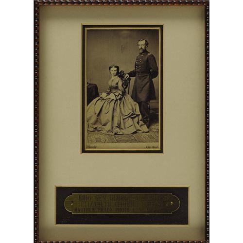 <B>Brigadier General George A. Custer and Elizabeth “Libby” Custer <I>Carte De Visite</B></I>,</B></I> by Matthew Brady & Co., New York, February, 1864. Custer's attractive young bride would outlive him by almost 60 years. Framed with a custom brass nameplate to an overall size of 8” x 10”. A small blemish in the upper field, very fine condition.<BR><BR><b>Shipping:</b> Miscellaneous Collectibles, Smal (<a target="_blank" href="http://www.heritageauctions.com/common/shipping.php">view shipping information</a>)