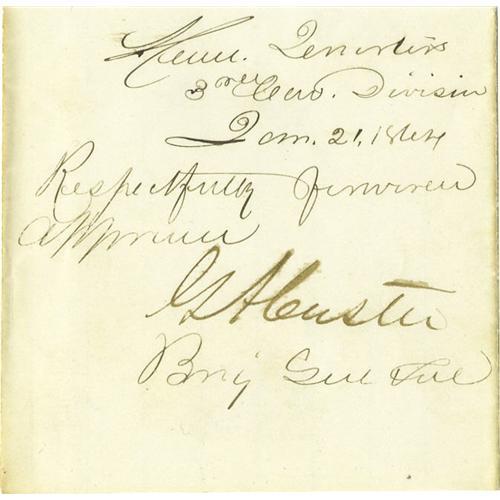 <B>Brigadier General George A. Custer Handwritten Document.</B></I> Dated January 21, 1864, this document was signed by Brigadier General George Armstrong Custer and is an approval by Custer of an order for forwarding up through the chain of command. It reads, "<I>Headquarters, 3rd Cav. Division, Jan. 21, 1864 Respectfully Forwarded, G. A. Custer, Brig. Gen. Com.</B></I>" and measures 3.5" x 3.5" on white paper. This is a nice dark autograph of Custer. The note is accompanied by two modern color prints of Custer, one leading a cavalry charge and the other a nice copy of the famous Matthew Brady print of Custer.<BR><BR>Custer wrote this note just three weeks before he was to marry his wife Elizabeth and two and one half years before his cavalry brigade would suffer the most losses of any Union cavalry force at Gettysburg. He would serve bravely throughout the Civil War and continue in the US Army to meet his fate at the Little Bighorn just 15 years after writing this note. This is a fine Custer note from his Civil War service ready for display.<BR><BR><b>Shipping:</b> Large Flat (<a target="_blank" href="http://www.heritageauctions.com/common/shipping.php">view shipping information</a>)