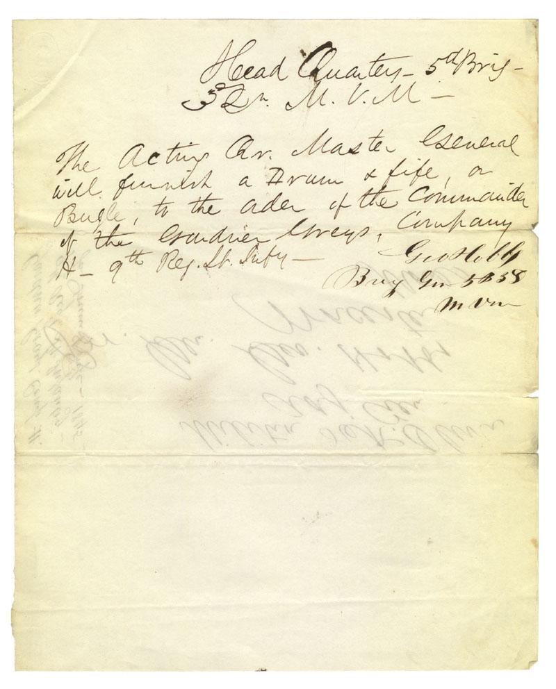 GEORGE HOBBS (1806-186?) Massachusetts businessman, soldier and a prominent citizen of Worcester. Hobbs became a commander of Worcester’s city guards in 1840 and rose to the rank of Brigadier General in the state militia. In addition, Hobbs served as a chief of Worcester’s fire department and as a city alderman. Document Signed, “Geo. Hobbs,” as brigadier general. One page, 8” x 10”. Headquarters, 5th Brig. 3rd M.V.M.” 1845. The document reads, in part: “ … The Acting Qrt. Master General will furnish a drum & fife, or bugle, to the order of the commander of the Gardner Greys [?] … ” Some light toning at edges. Slight paper loss at edges of fold. Overall Fine