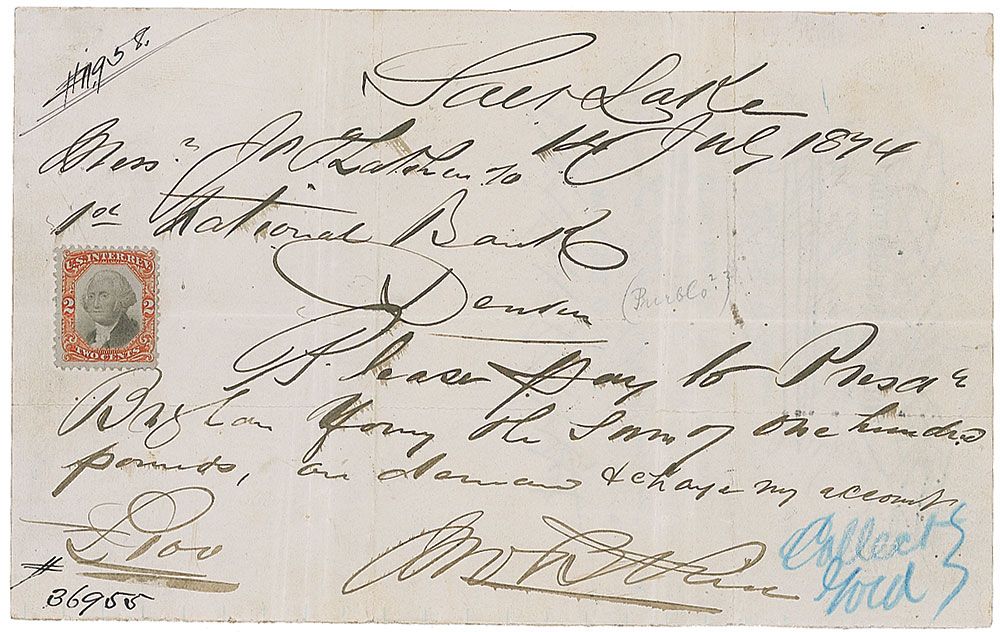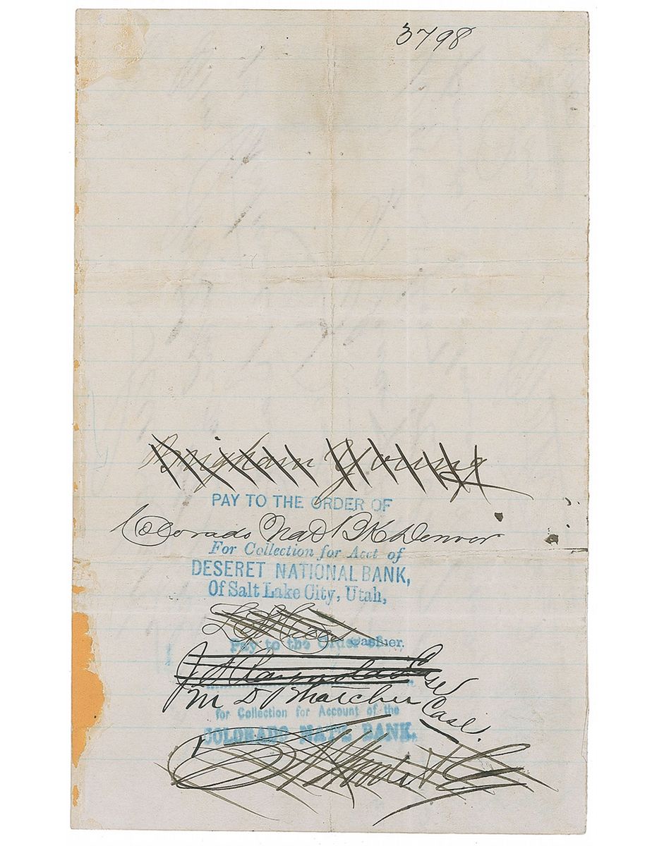 Endorsement signature, “Brigham Young,” on the reverse of a manuscript check on an 8 x 5 lightly-lined sheet made out to him by John B. Price for £100, July 14, 1874. Accompanied by an ALS from Price to Young presenting the check in thanks for “the strenuous exertions you have put forward toward the elevation of the people of Utah. Not being a Mormon myself, I donate this.” Interestingly, Price was apparently quite a scoundrel—the letter bears a period notation: "John B. Price alias ‘Lord Littleton’… forwarded the Des[eret] National Bank for collection and sent to every bank in Denver—but no good—nothing but [a] bummer's check. " In very good condition, with heavy ink stroke cancellations to signature, intersecting folds (touching signature, though not affecting legibility), a revenue stamp affixed to the front, a few minor adhesive and mounting remnants, and scattered wrinkling and soiling. Despite the flaws, the signature is dark and fully visible beneath the cancellation.