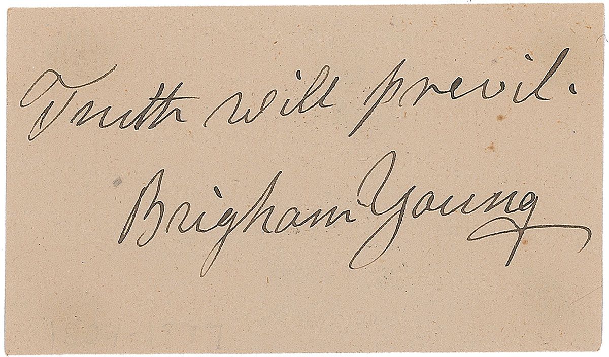 Crisp AQS on an off-white 3 x 1.75 slip, signed “Brigham Young.” In full: “Truth will prevail.” In fine condition. A desirable sentiment from the Mormon leader.