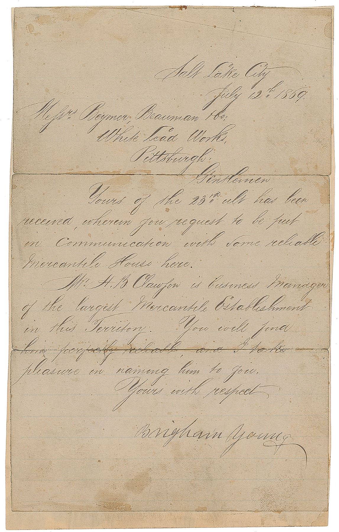 LS, one page, 5 x 7.75, July 12, 1869. Letter sent from Salt Lake City to Beymer, Beauman, & Co. of the White Lead Works in Pittsburgh, in part: "Mr. H. B. Clawson is business manager of the largest Mercantile Establishment in this Territory. You will find him perfectly reliable, and I take pleasure in naming him to you." Affixed to a slightly larger backing sheet. In very good condition, with scattered light staining, and evidently complete separation along the two horizontal folds.