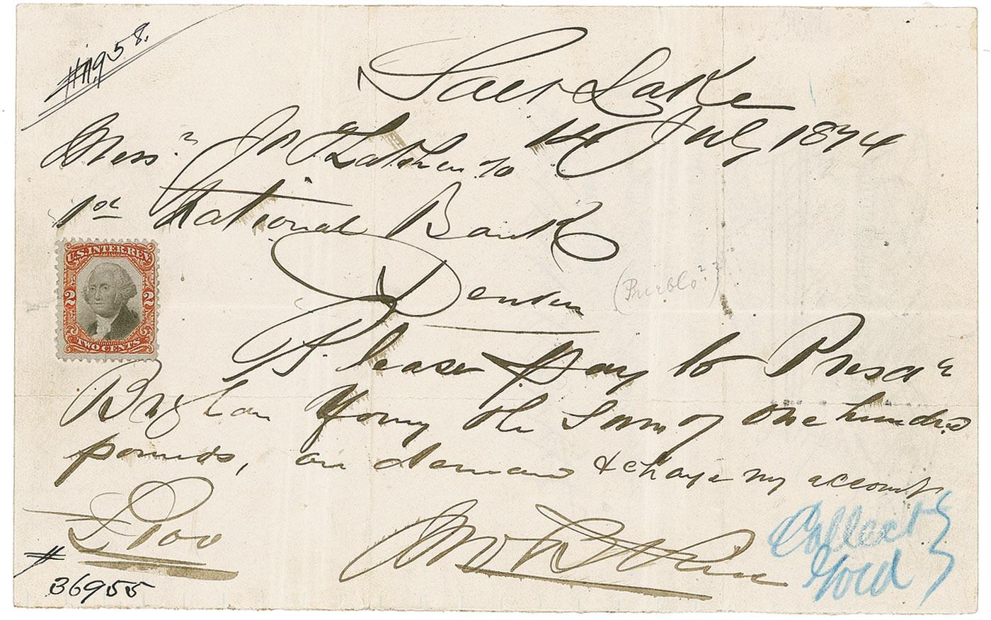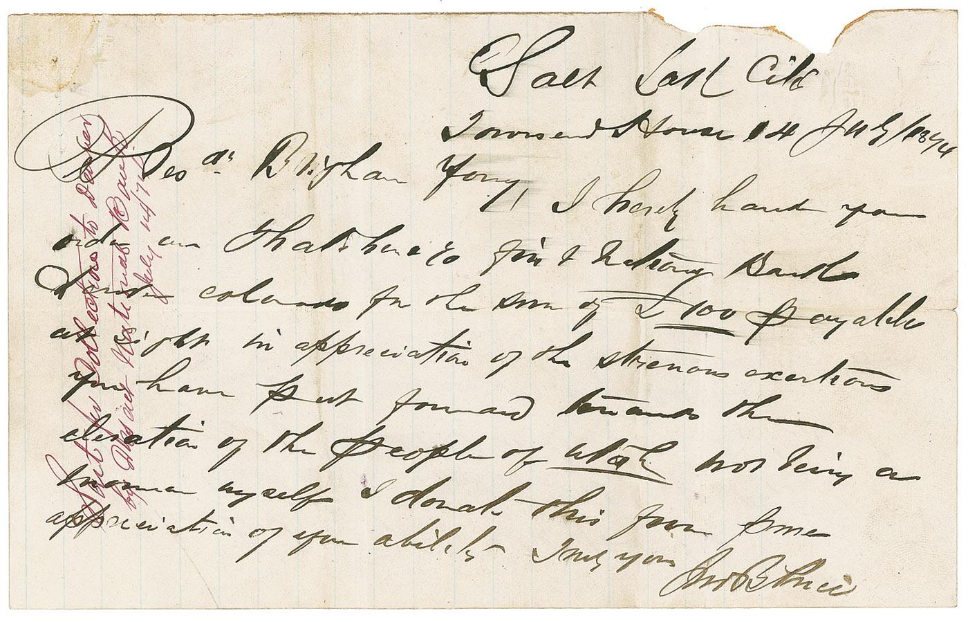 Endorsement signature, “Brigham Young,” on the reverse of a manuscript check on an 8 x 5 lightly lined sheet made out to him by John B. Price for £100, July 14, 1874. Accompanied by an ALS from Price to Young presenting the check in thanks for “the strenuous exertions you have put forward toward the elevation of the people of Utah. Not being a Mormon myself, I donate this….” In very good condition, with heavy ink stroke cancellations to signature, intersecting folds (touching signature, though not affecting legibility), a few minor adhesive traces, and scattered wrinkling and soiling. The signature is dark and fully visible beneath the cancellation.