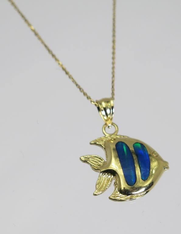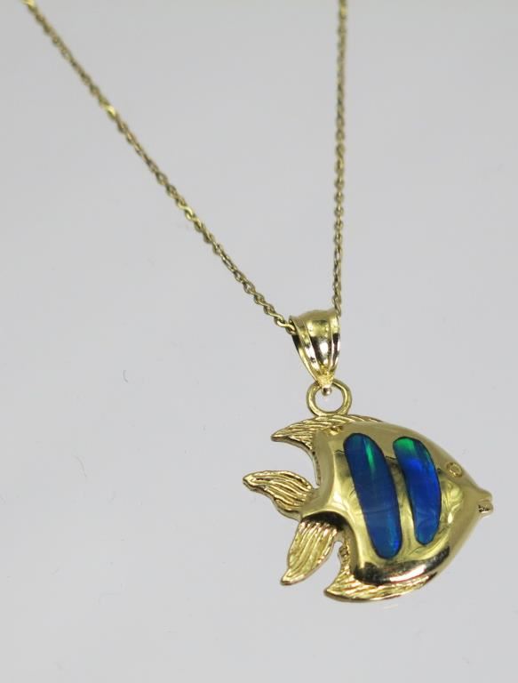 Inlaid opal in vibrant blues and greens set in 14 karat yellow gold with 10 karat yellow gold chain.