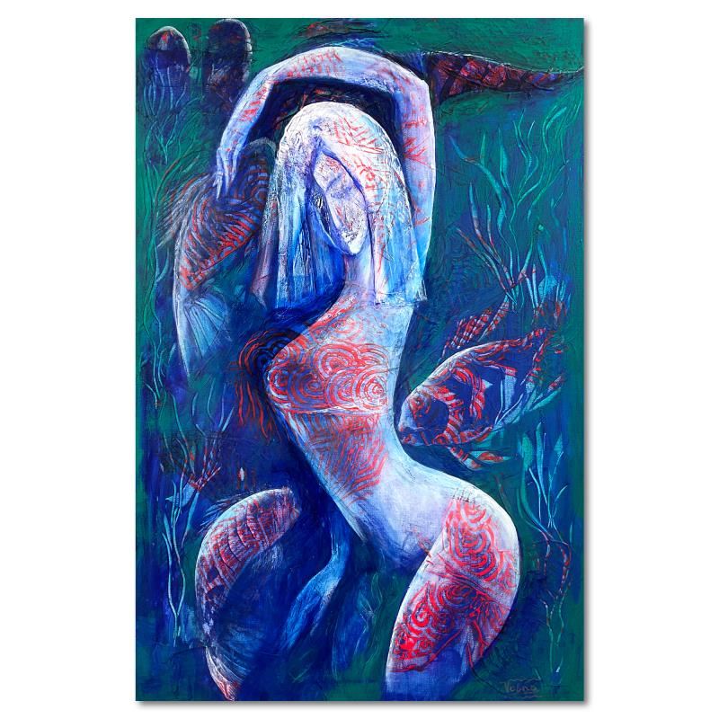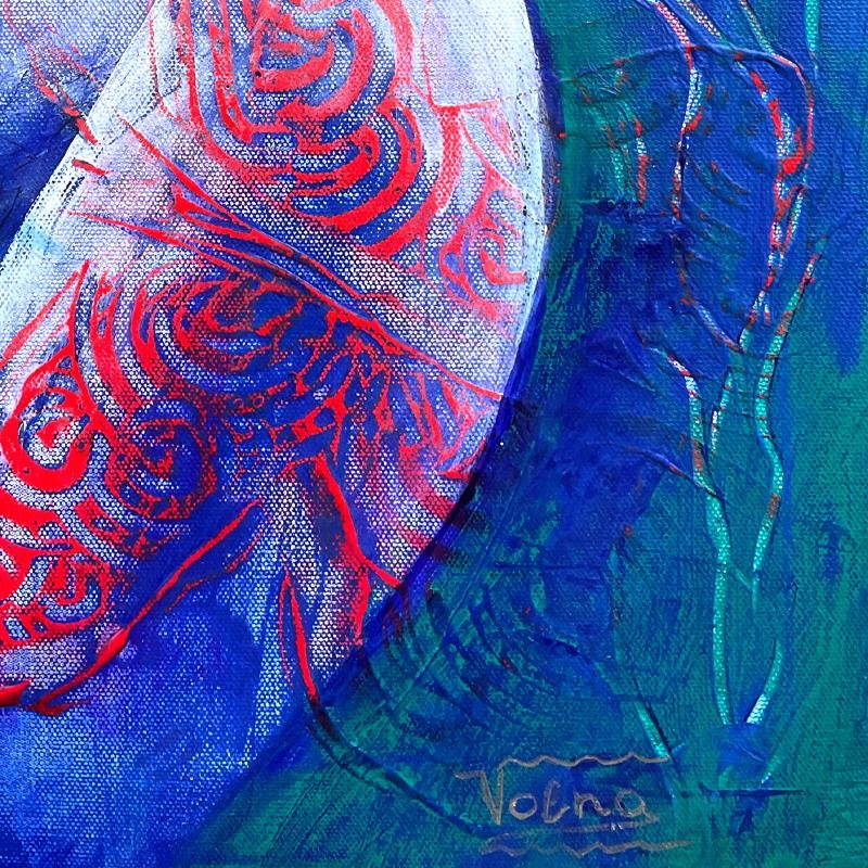 "Bright Eternity" is an original acrylic painting on stretched canvas by Nadia Volna, hand signed by the artist. This piece is painted with light-reactive black light paint that reveals brilliant colors when viewed under incandescent light. This piece comes with a blacklight flashlight (batteries not included). Includes Letter of Authenticity. Measures approx. 24" x 36" (image).