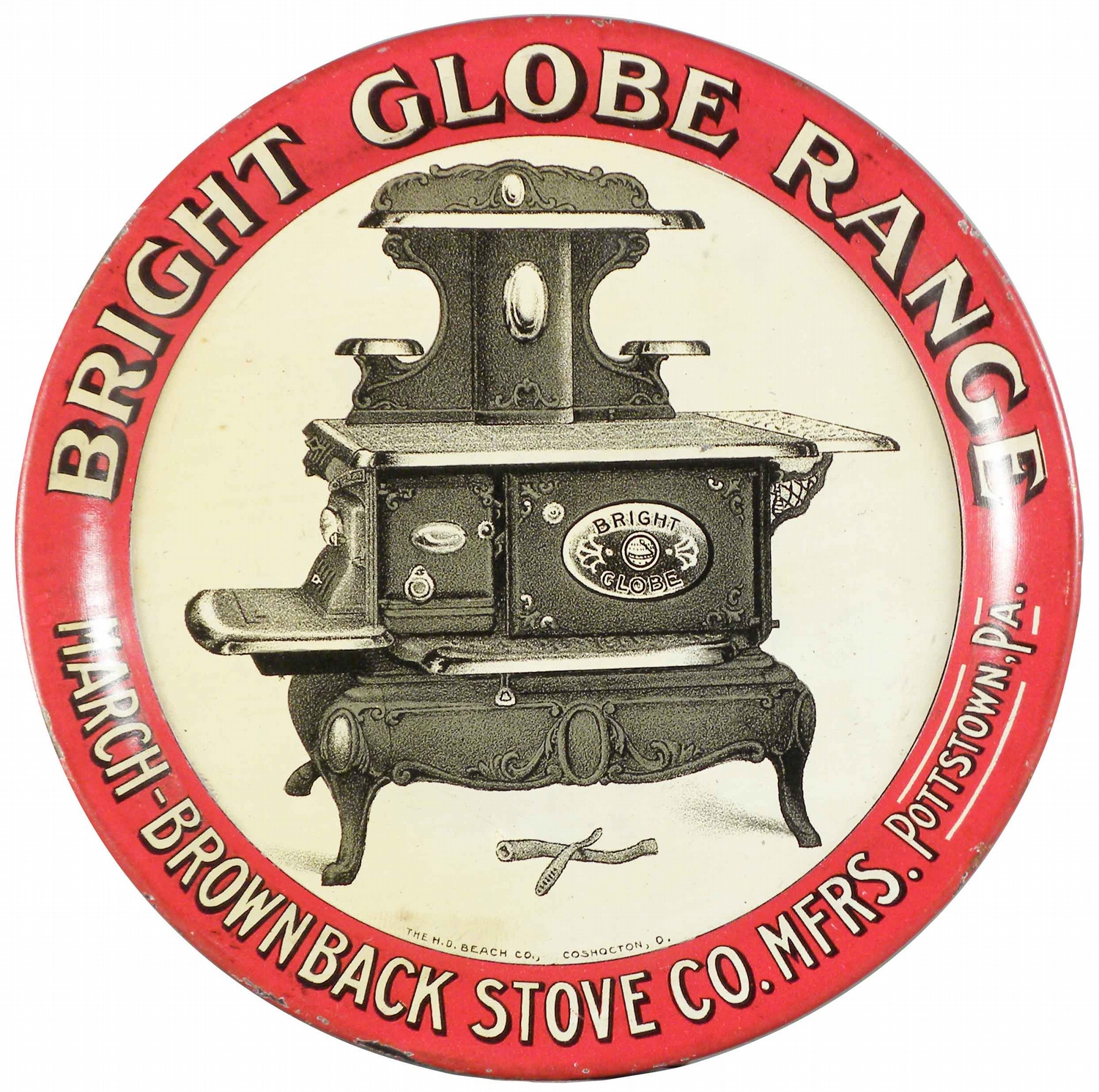 Bright Globe Range Tin Tip Tray. March-Brownback Stove Co. Mfgs. Pottstown, PA. Very minor edge ware otherwise near mint condition. 4 1/4 inch diameter.