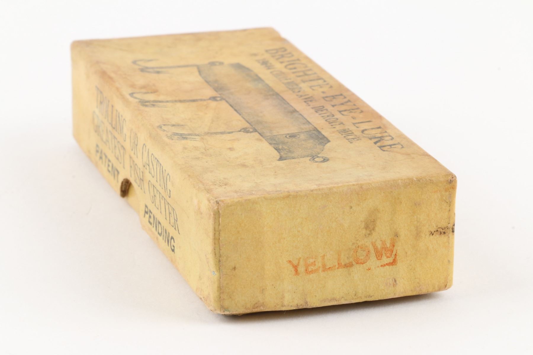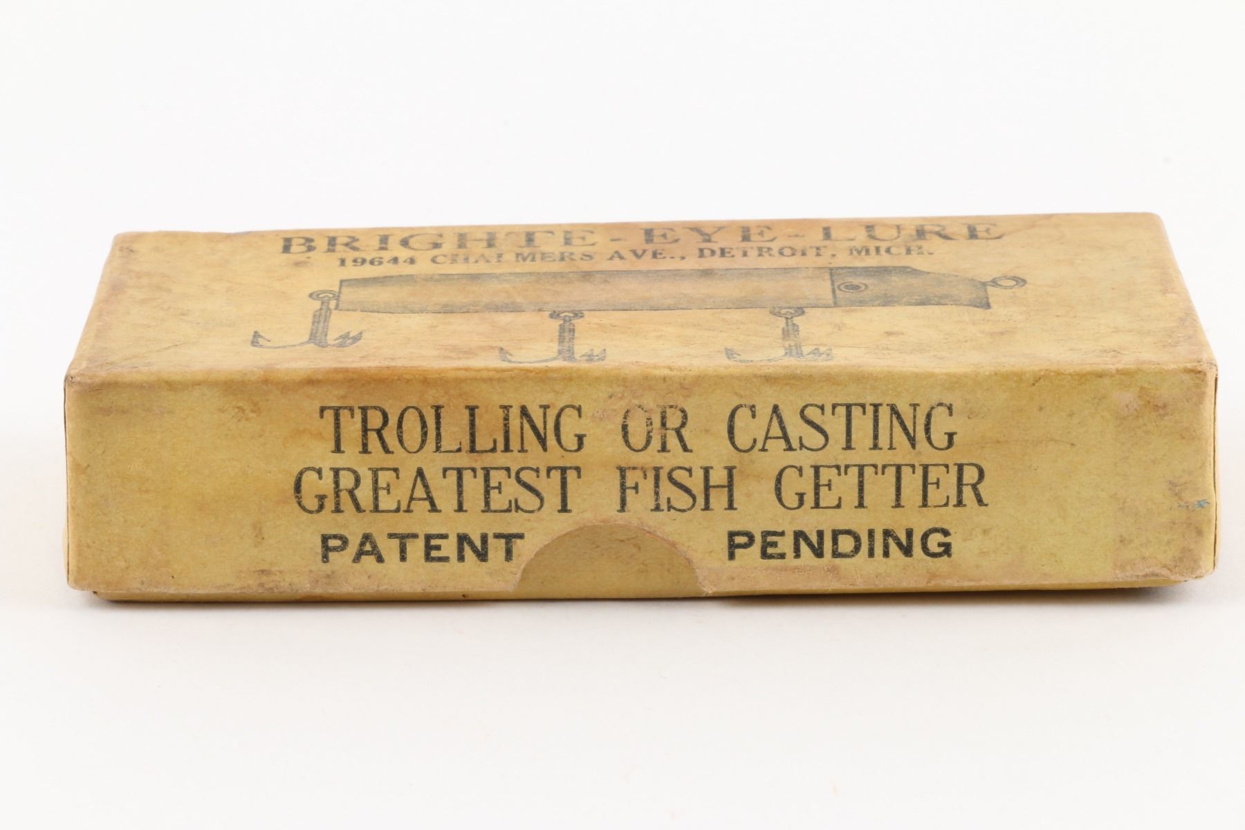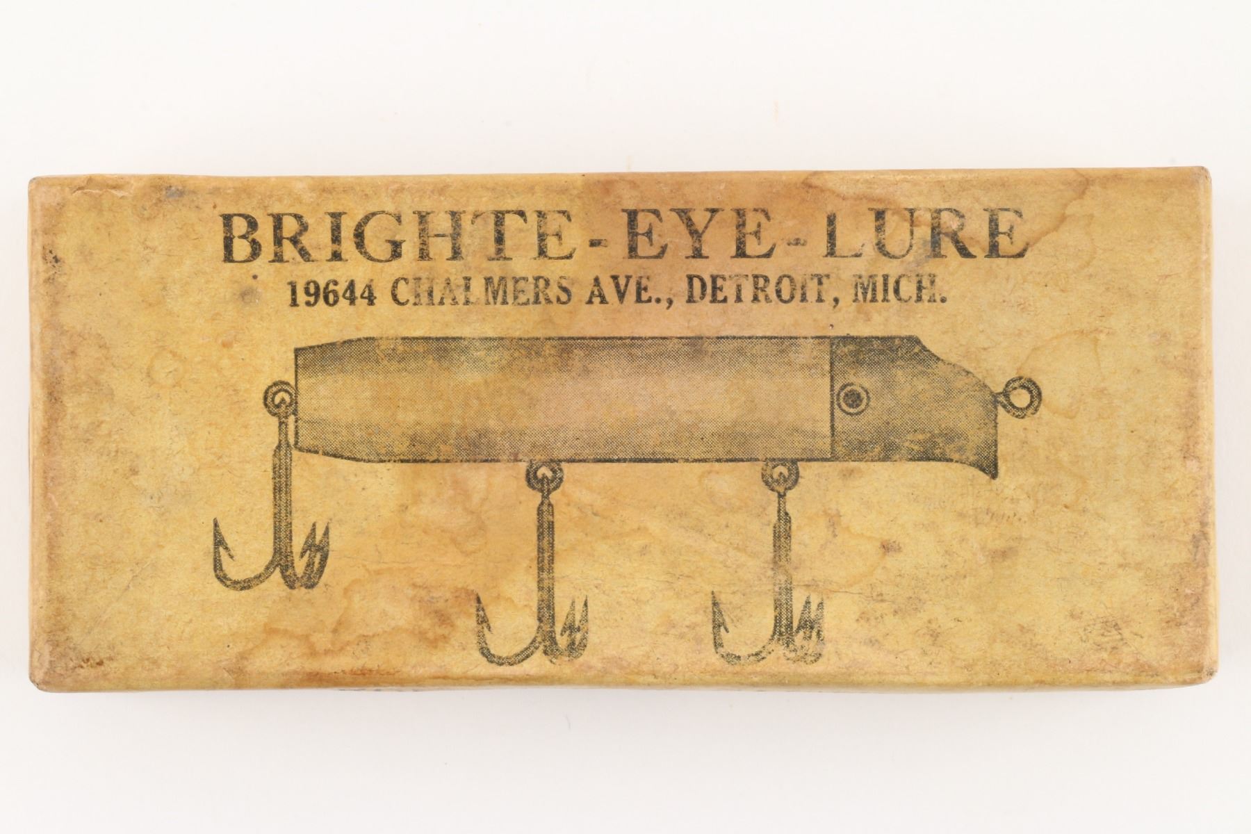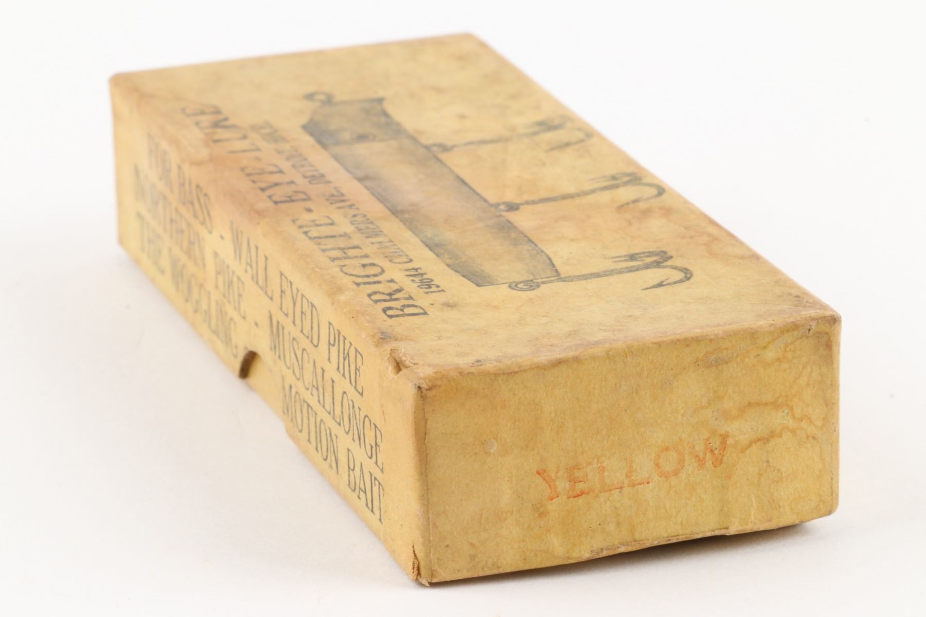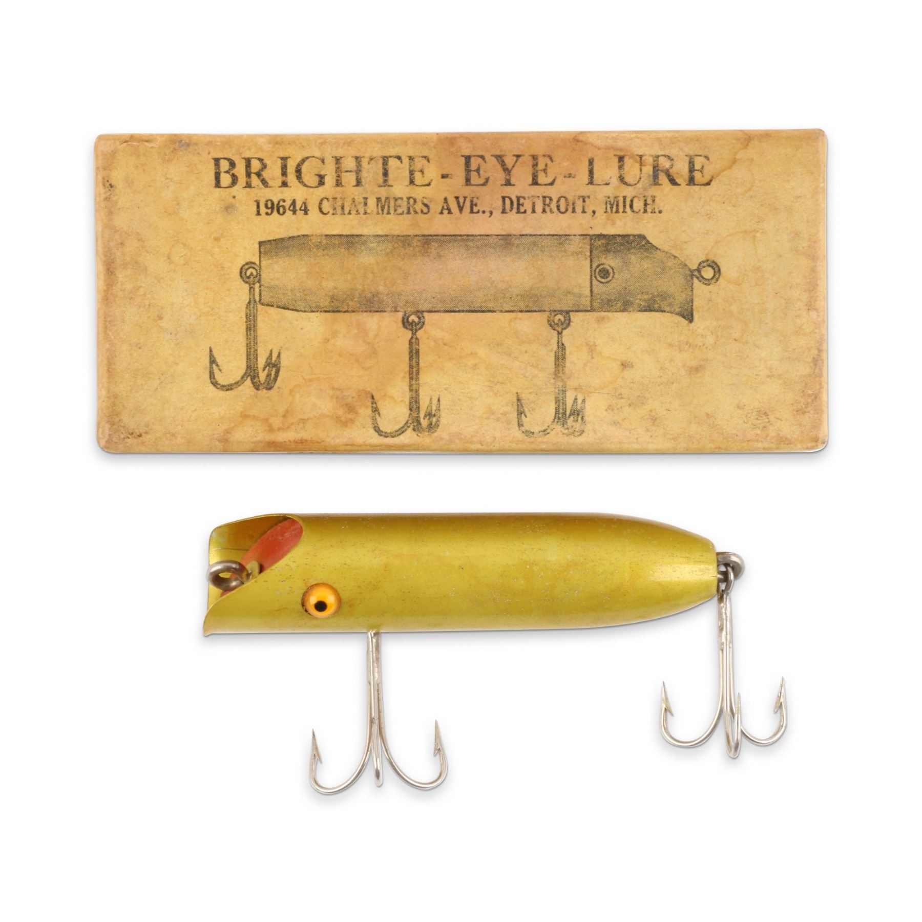 Bright-Eye Lure, United States. 1930s. Boxed. Material: Wood, Aluminum. Quantity: 1. Grade: EX. 4.5" x 2" x 1" Est. $150-250.