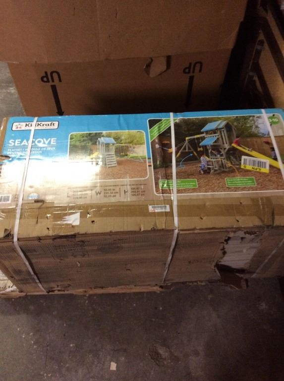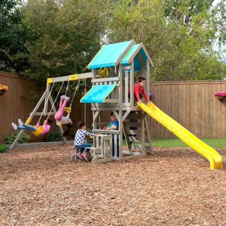 playset in new light colors that provide cooler surfaces for little kids to play. The KidKraft Seacove Playset offers up more than 10 play features, so there's an activity for all your kids and their friends. Swings and acrobar are instant attractions, plus they all have soft-touch rope so it's easier on delicate hands. Watch kids scurry up the rock wall ladder to create wild make believe stories on the covered deck. A steering wheel helps navigate the play. They can slide down to the bottom to continue their stories with the serving station. Kids can pretend they are at food service window or use the covered area as a puppet show station. A bench and table is the perfect spot for an audience. There's even room for a sandbox underneath. Little ones will love having this welcoming set in their backyard. And, with a five-year warranty and child-friendly water-based stain, parents will know they made the right choice in outdoor play.